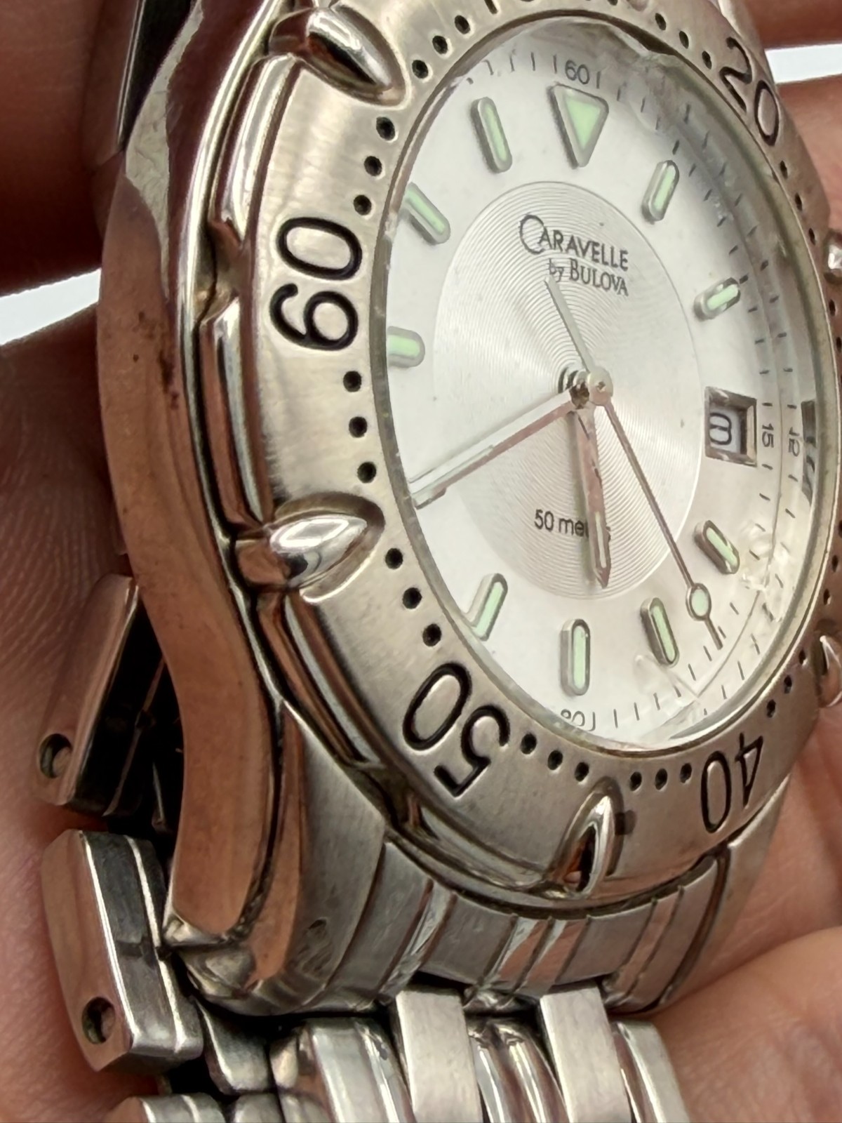 Caravelle by Bulova 43A Stainless Steel Watch Date Silver Dial Quartz Works