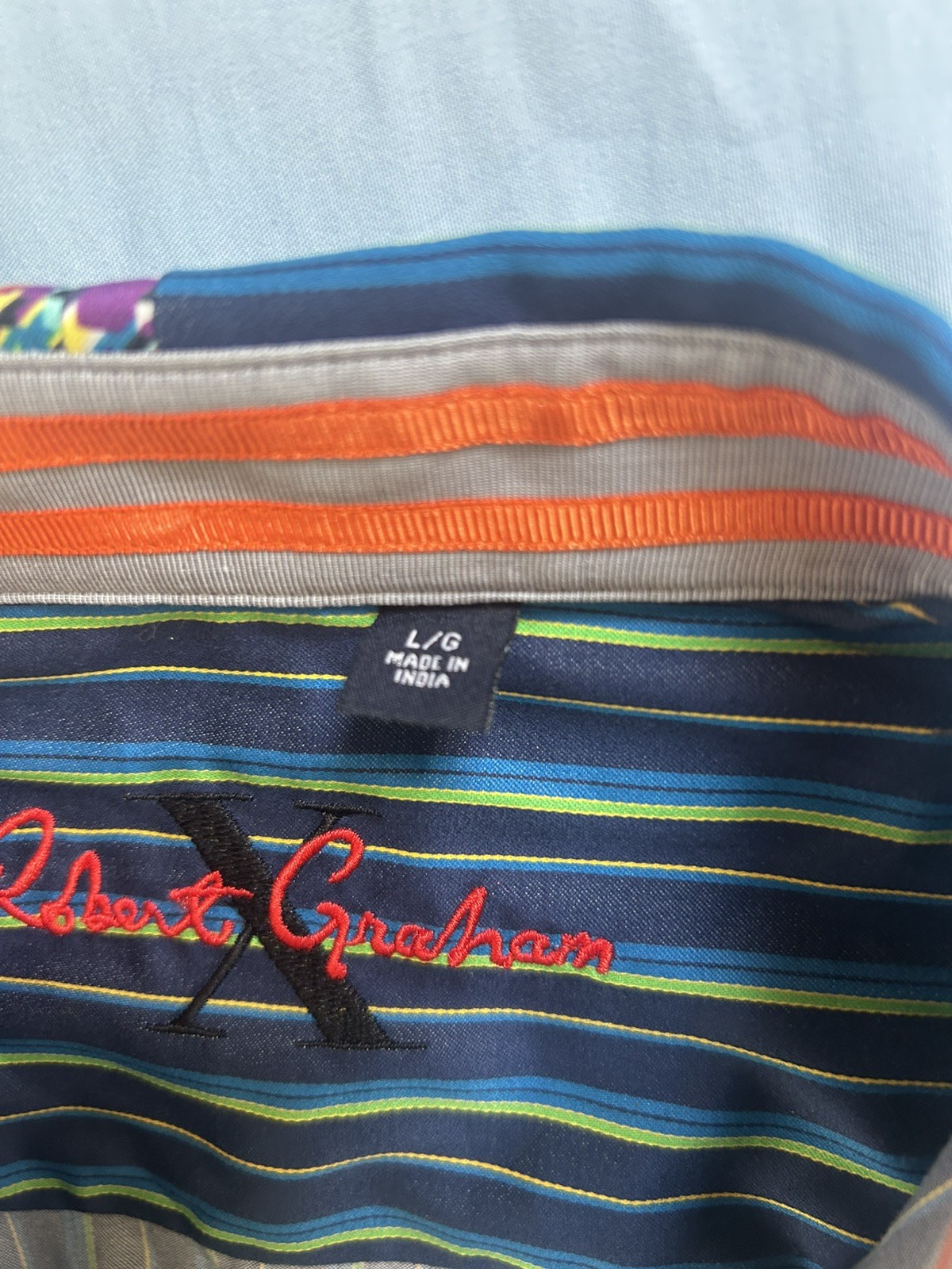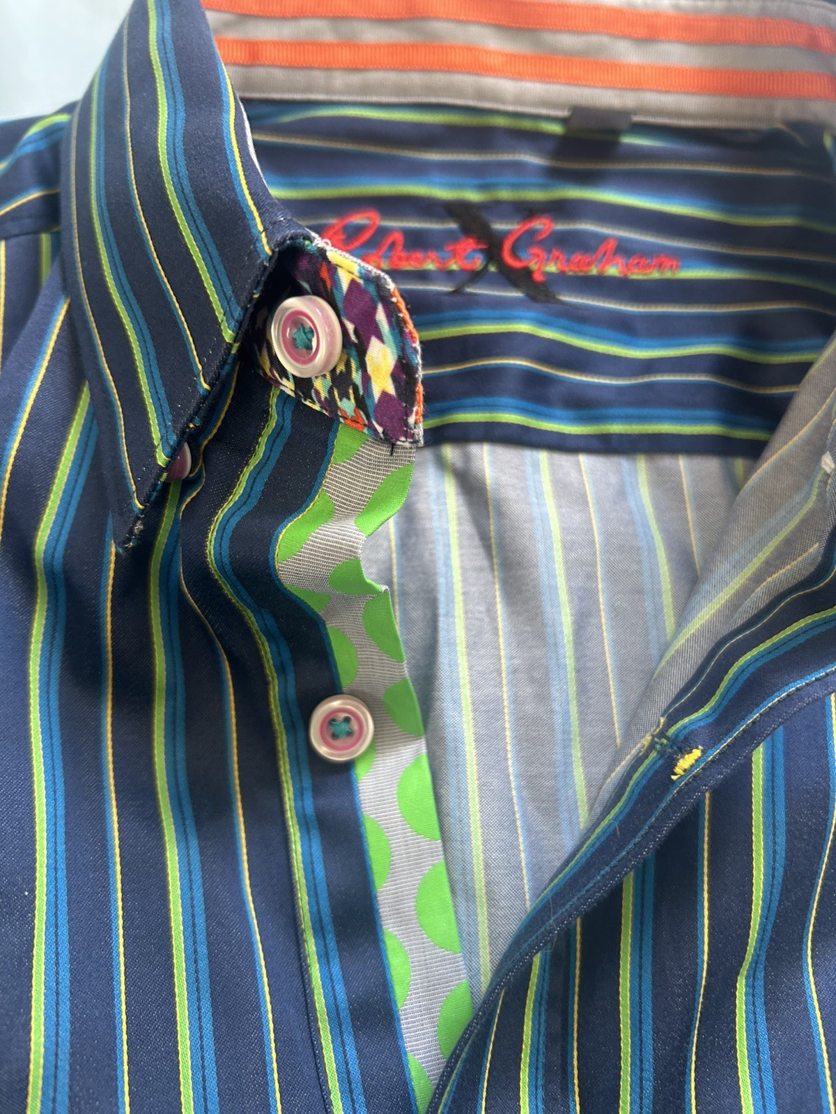 Robert Graham Shirt Mens L blue Green Striped Long sleeve button up down shirt