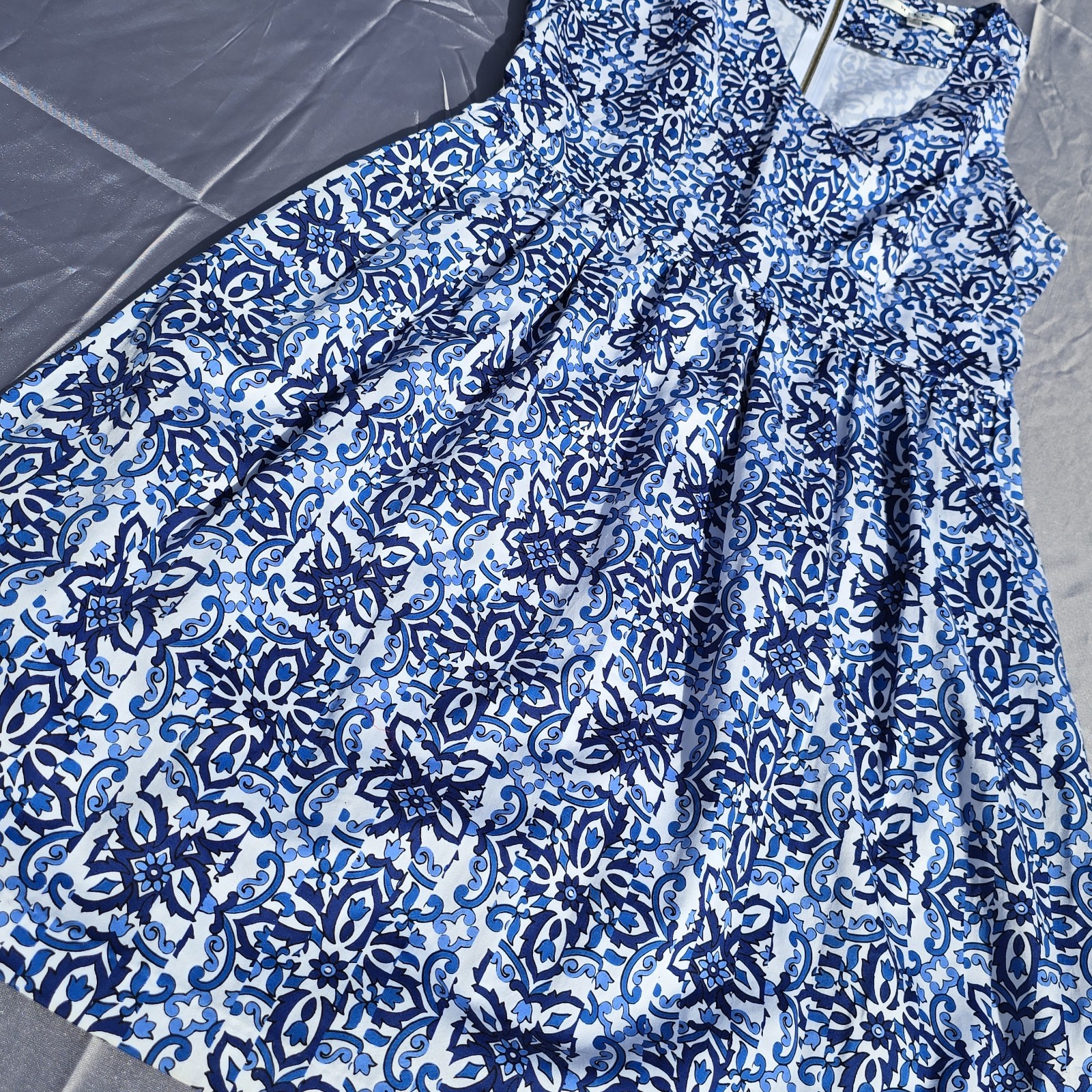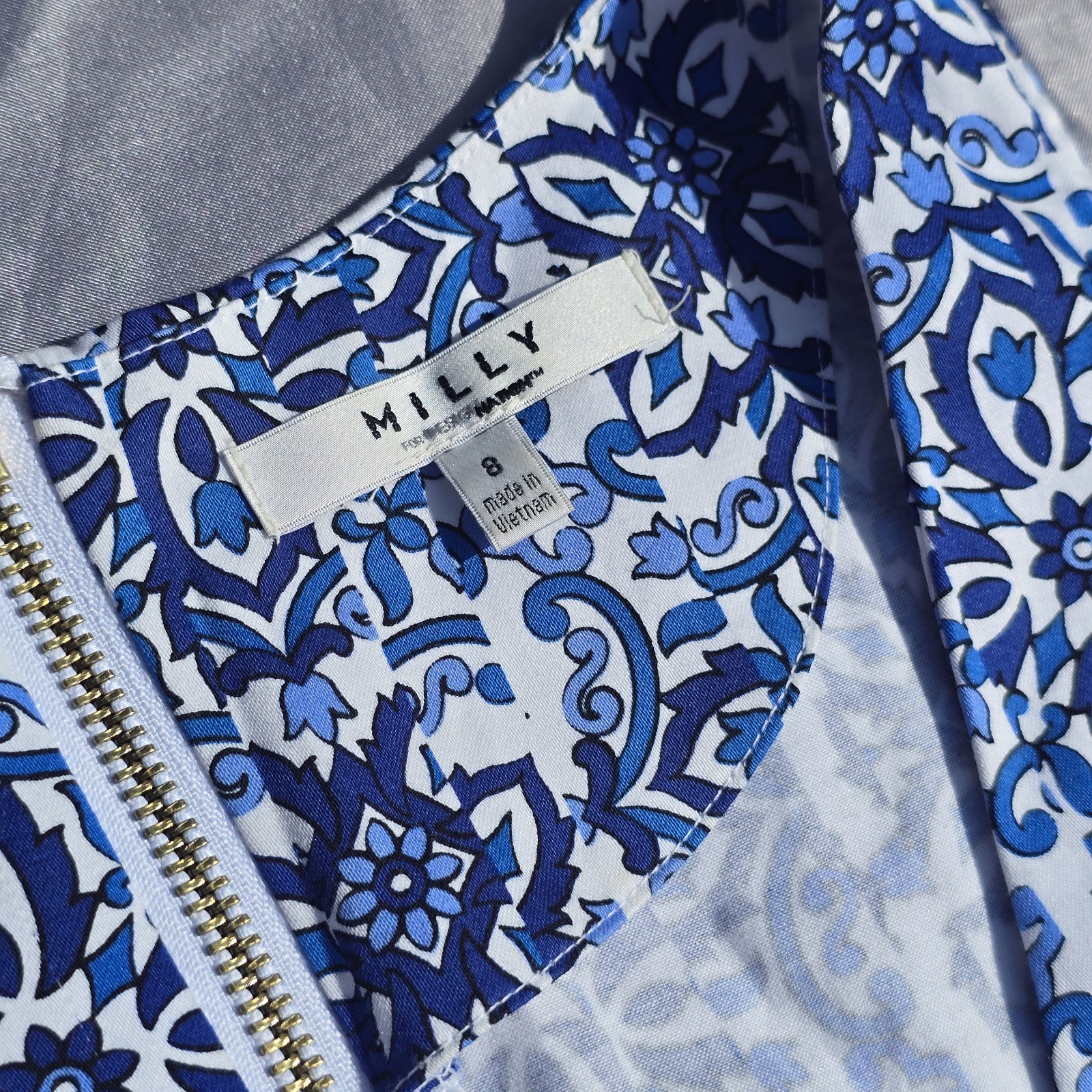 как выглядит Milly Women Floral Print Fit Flare Dress Sz 8 Blue White Sleeveless V Neck фото