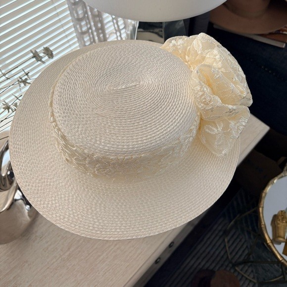 VTG Cream Polypropylene Straw Lace Ribbon Bow Hat