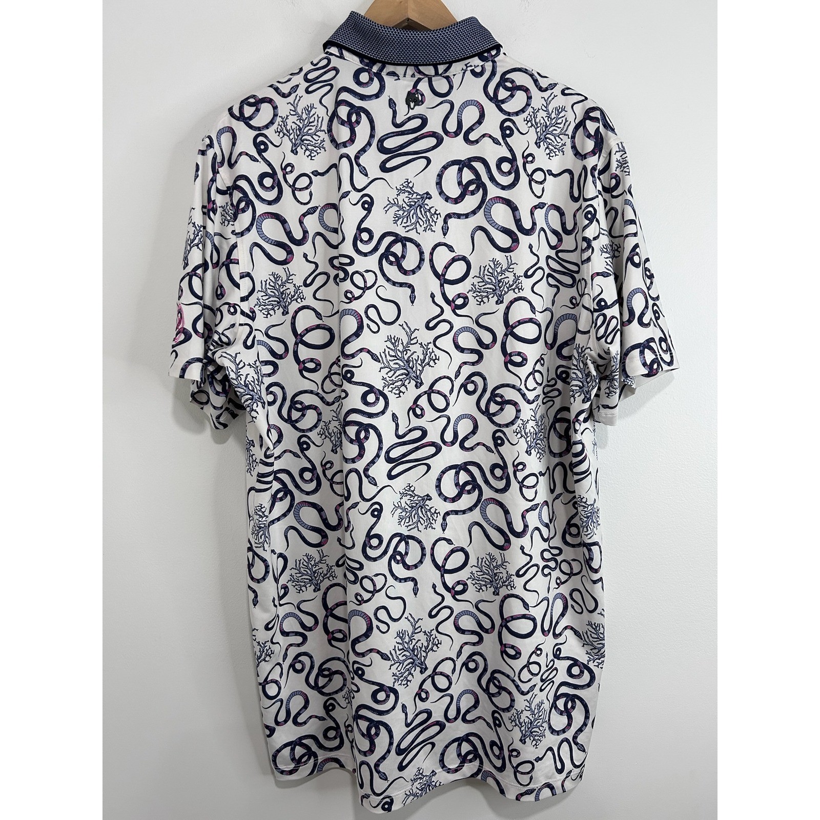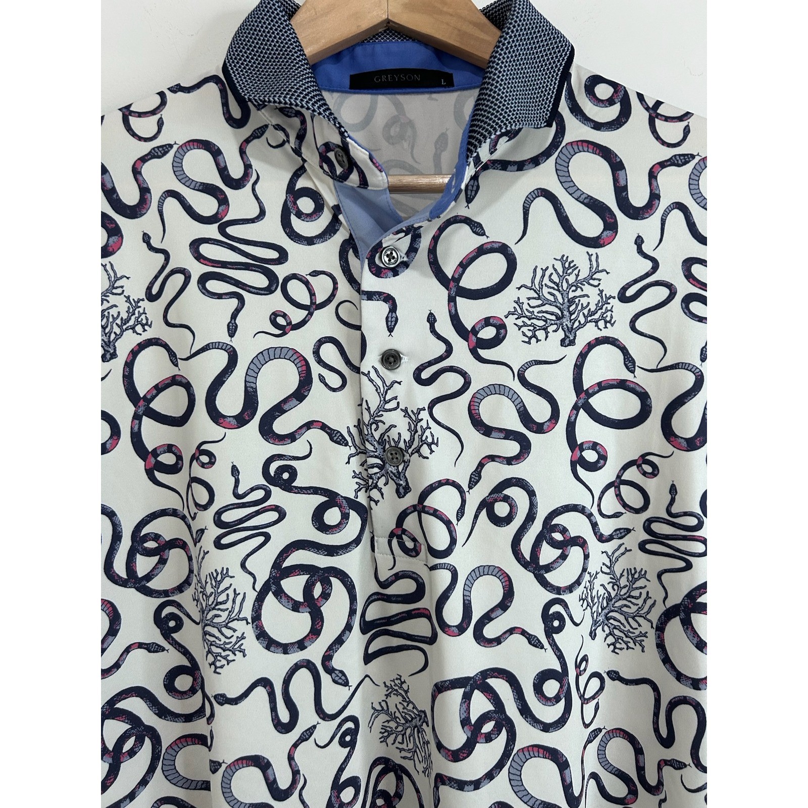 как выглядит Greyson Mens Polo Shirt Sz L Snake Coral Novelty Print Performance Golf Athletic фото