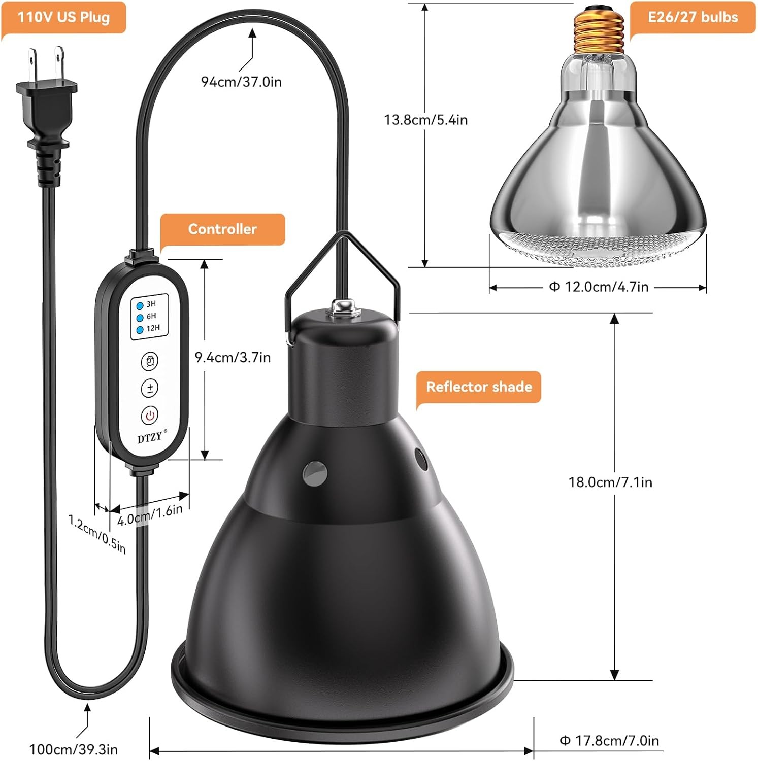 Reptile Light Fixture 7Inch Deep Dome 3/6/12 Timer Infrared Heat Lamp Max 150W