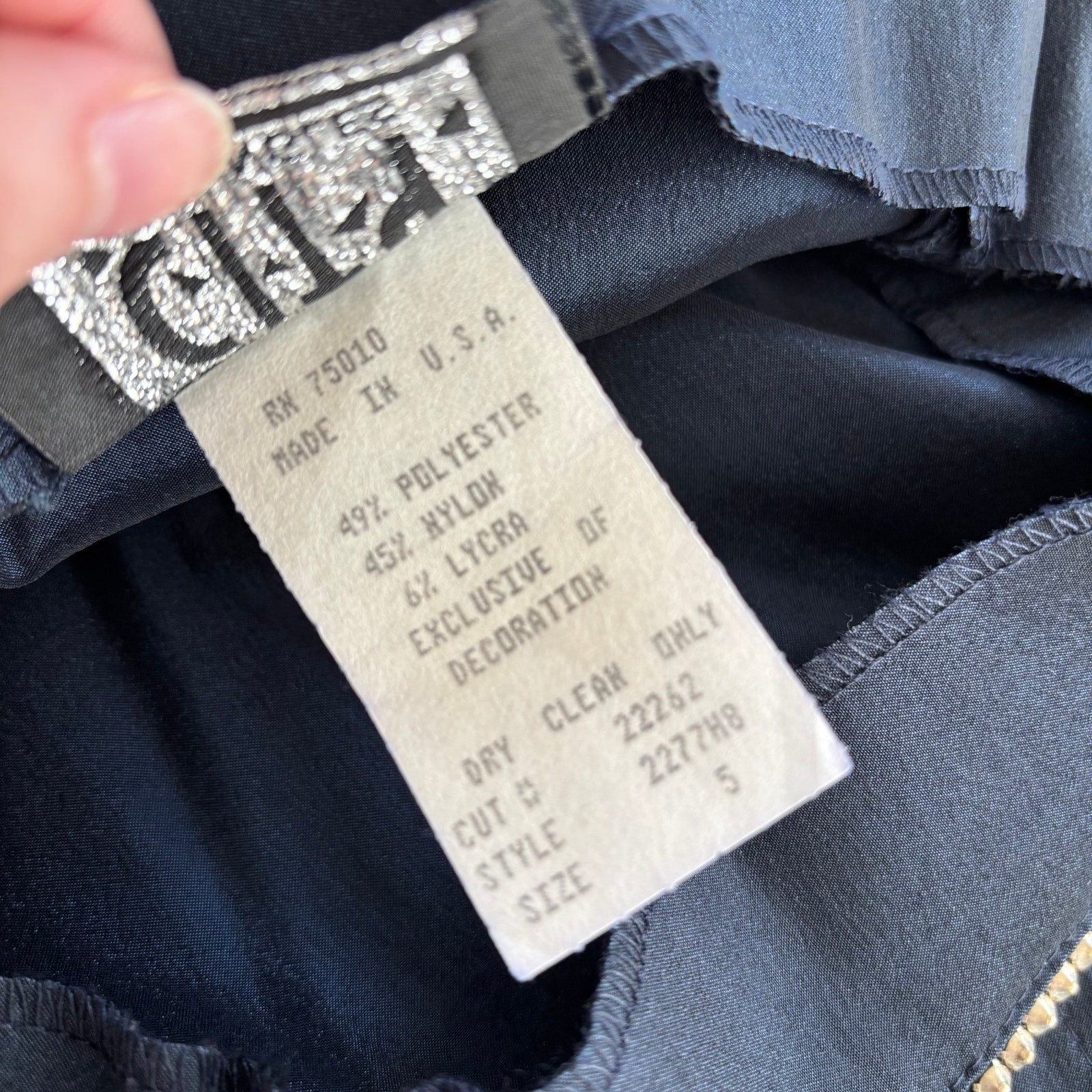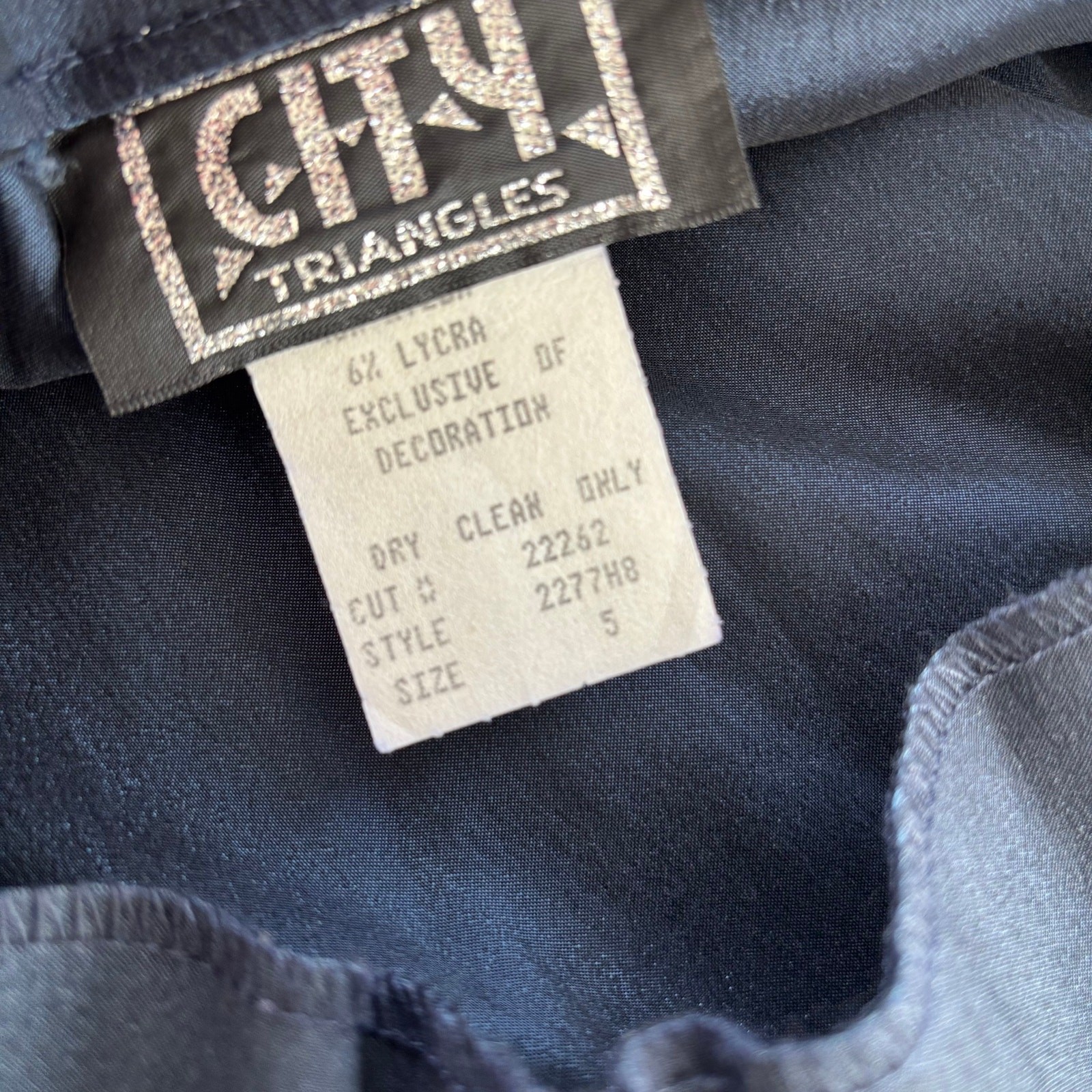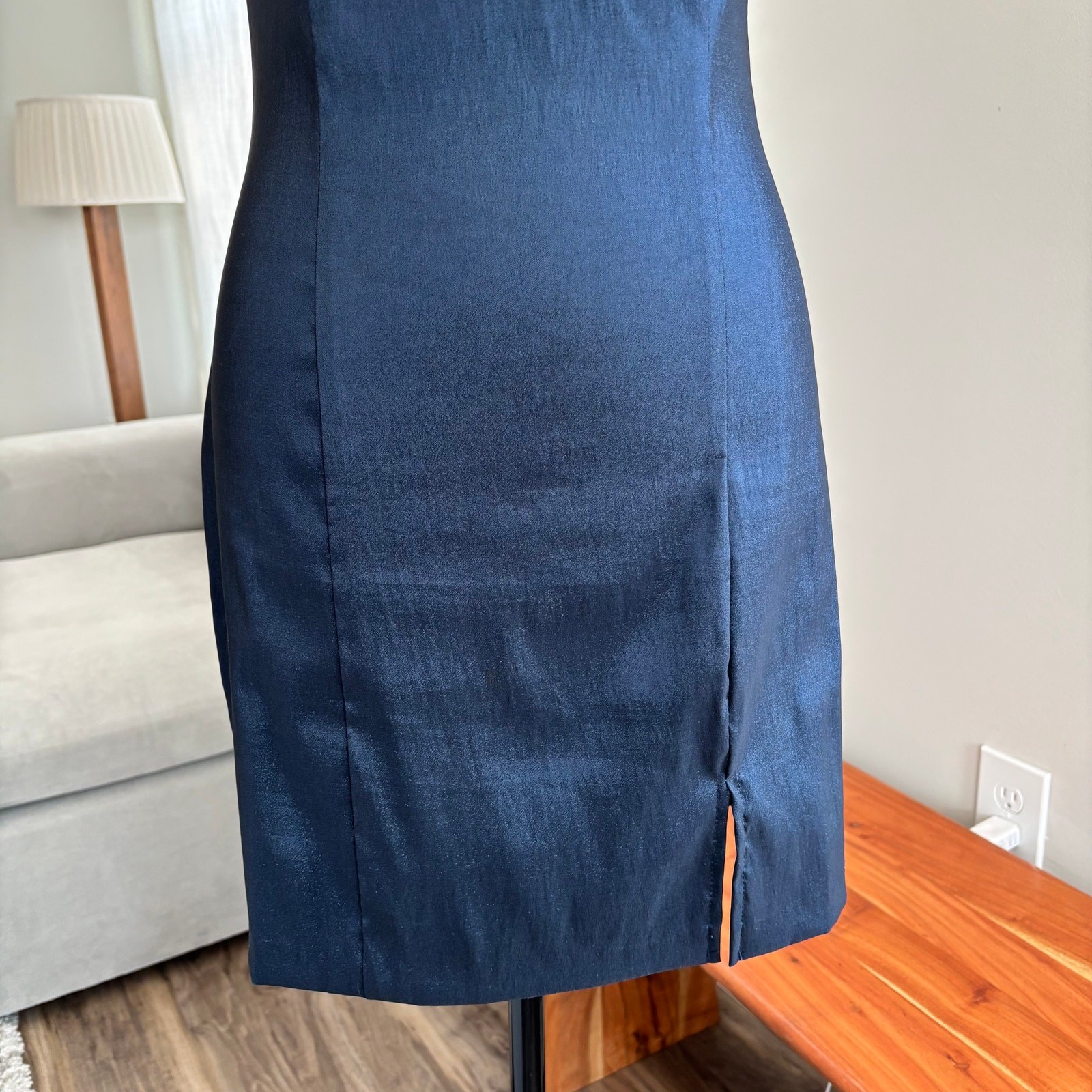 как выглядит 90s Vintage City Triangles Shimmer Satin Blue Dress Rhinestone Neckline Size 5 фото