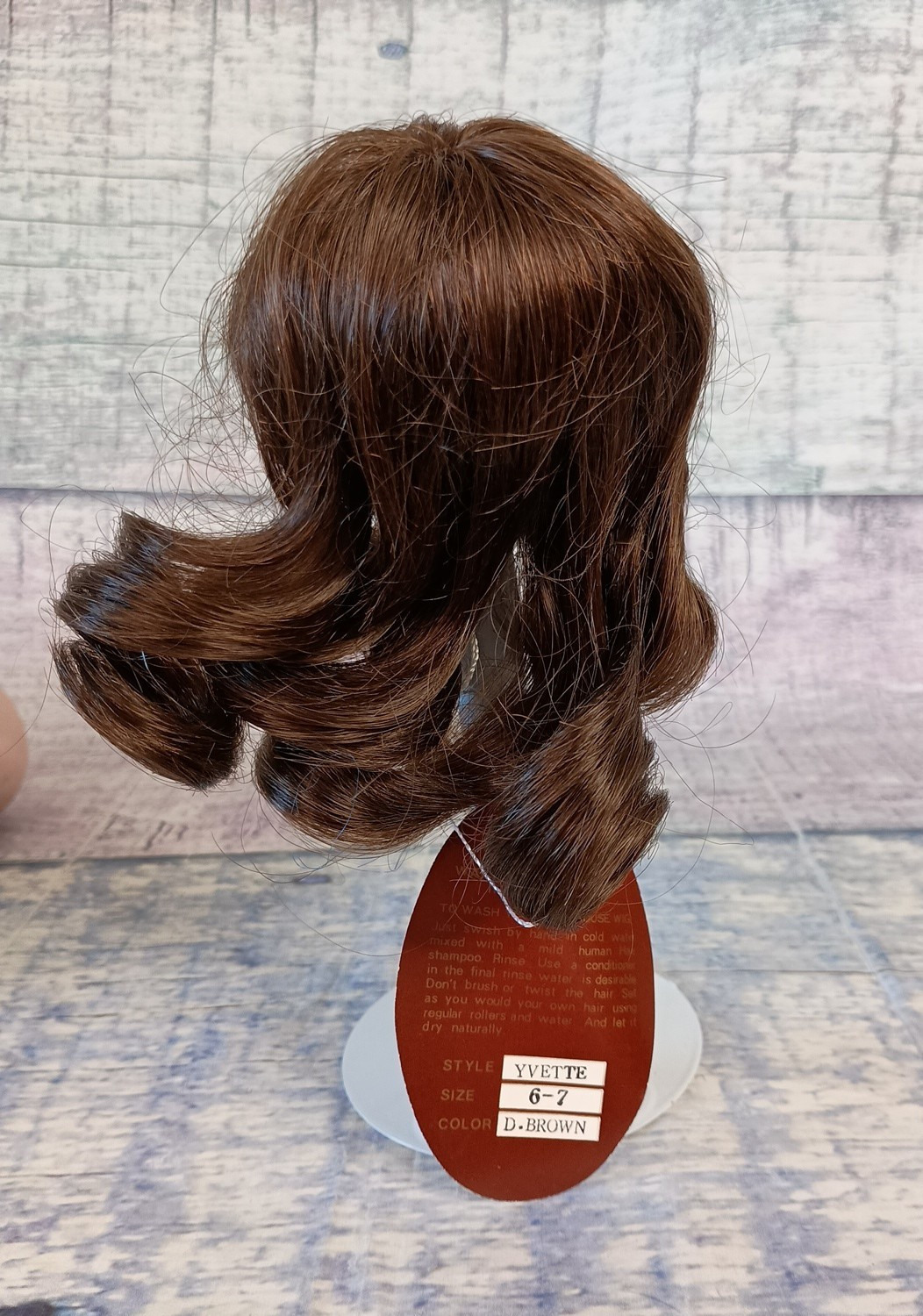 Playhouse YVETTE Doll Wig Human Hair Size 6-7 Dark Brown Long Curls and Bangs