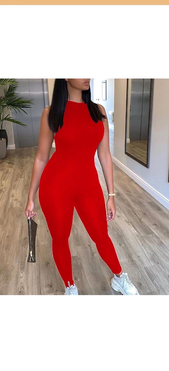 как выглядит Red Sleeveless Slim Fit Jumpsuit, High Neck, Straight Leg, Pullover фото