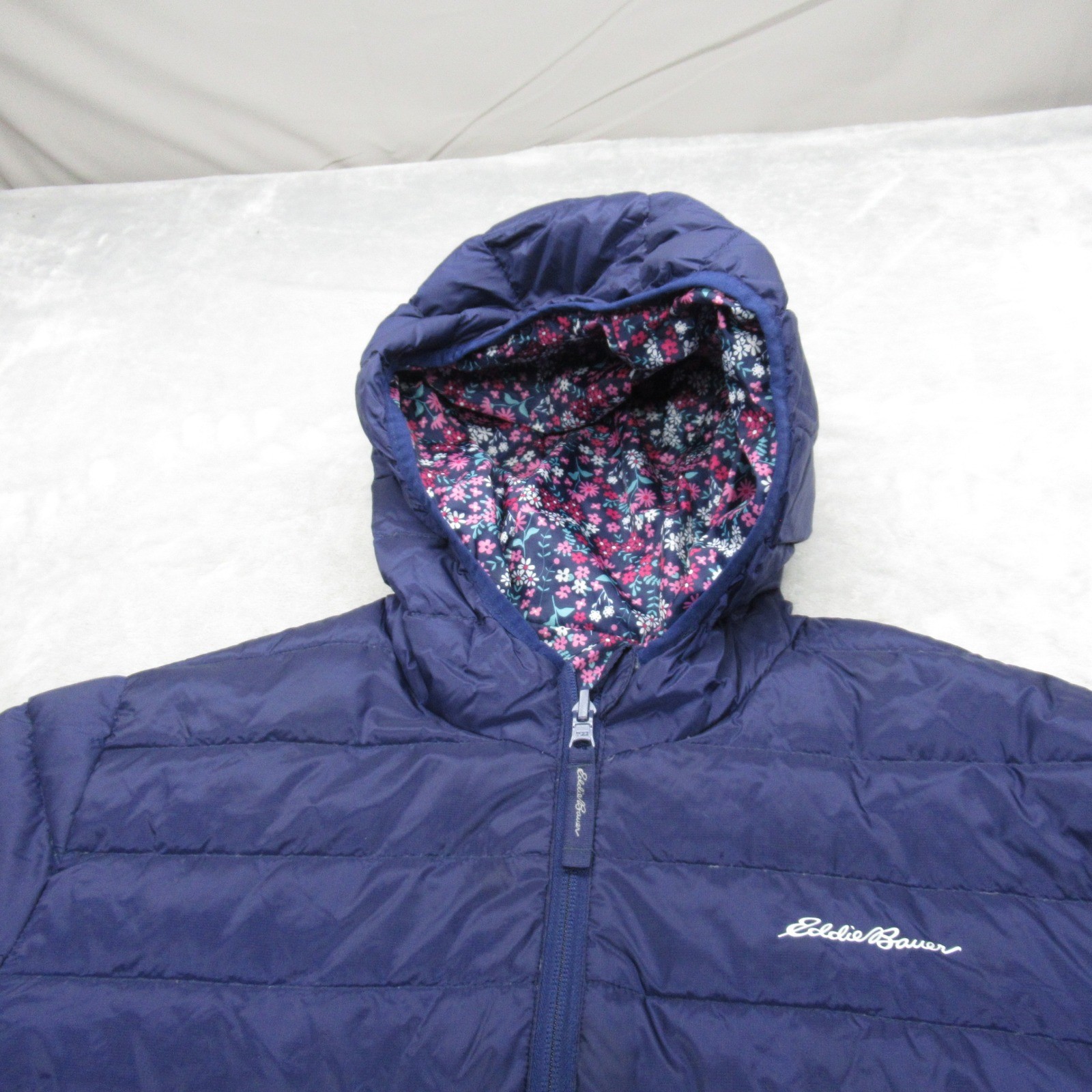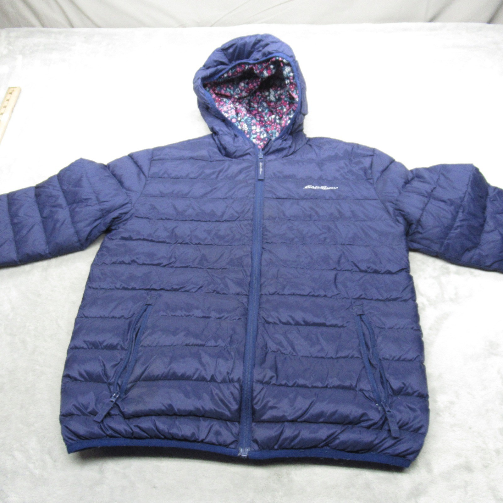 как выглядит Eddie Bauer Down Jacket Kids XL 16 Blue Floral Reversible Insulated Hooded Puff фото