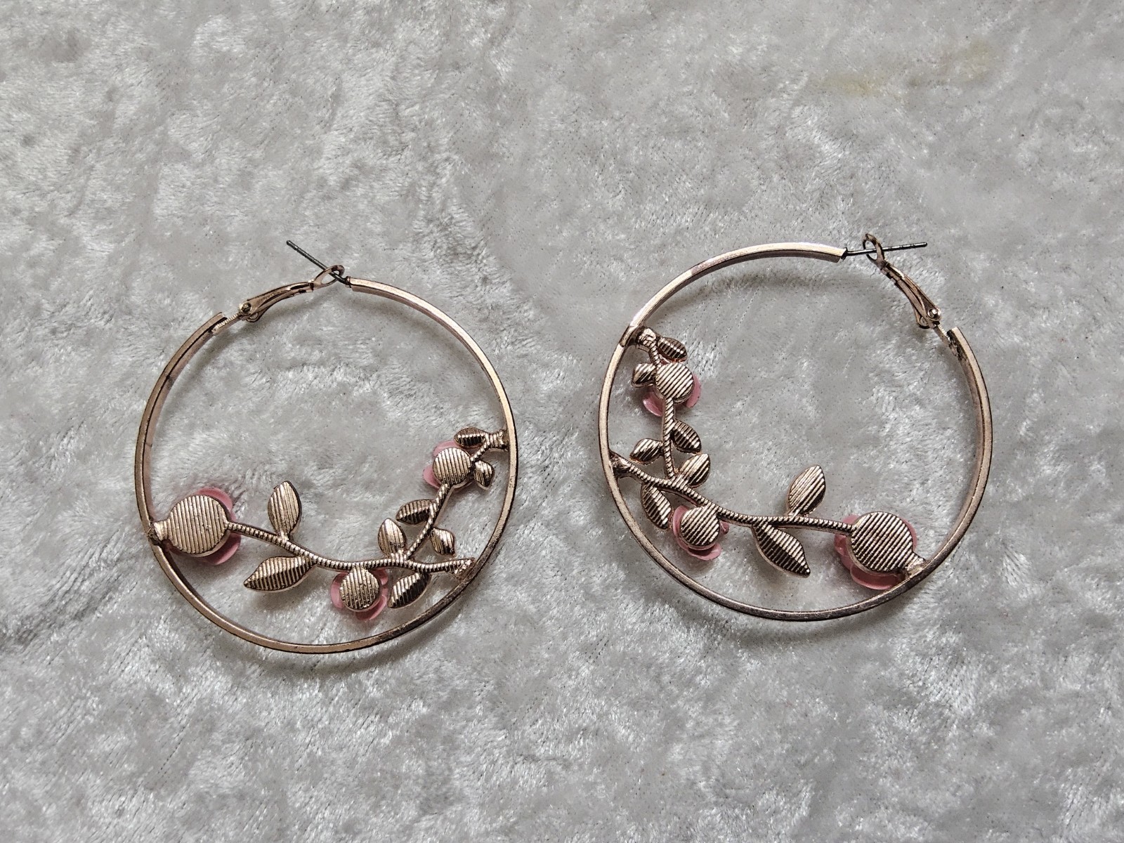 как выглядит Pink Tone 3D Pink Roses 3" Hoop Earrings, Green Enamel Leaves фото