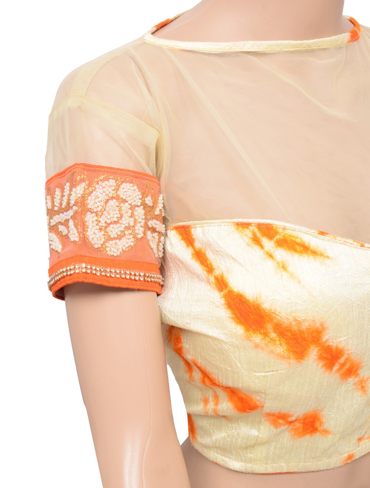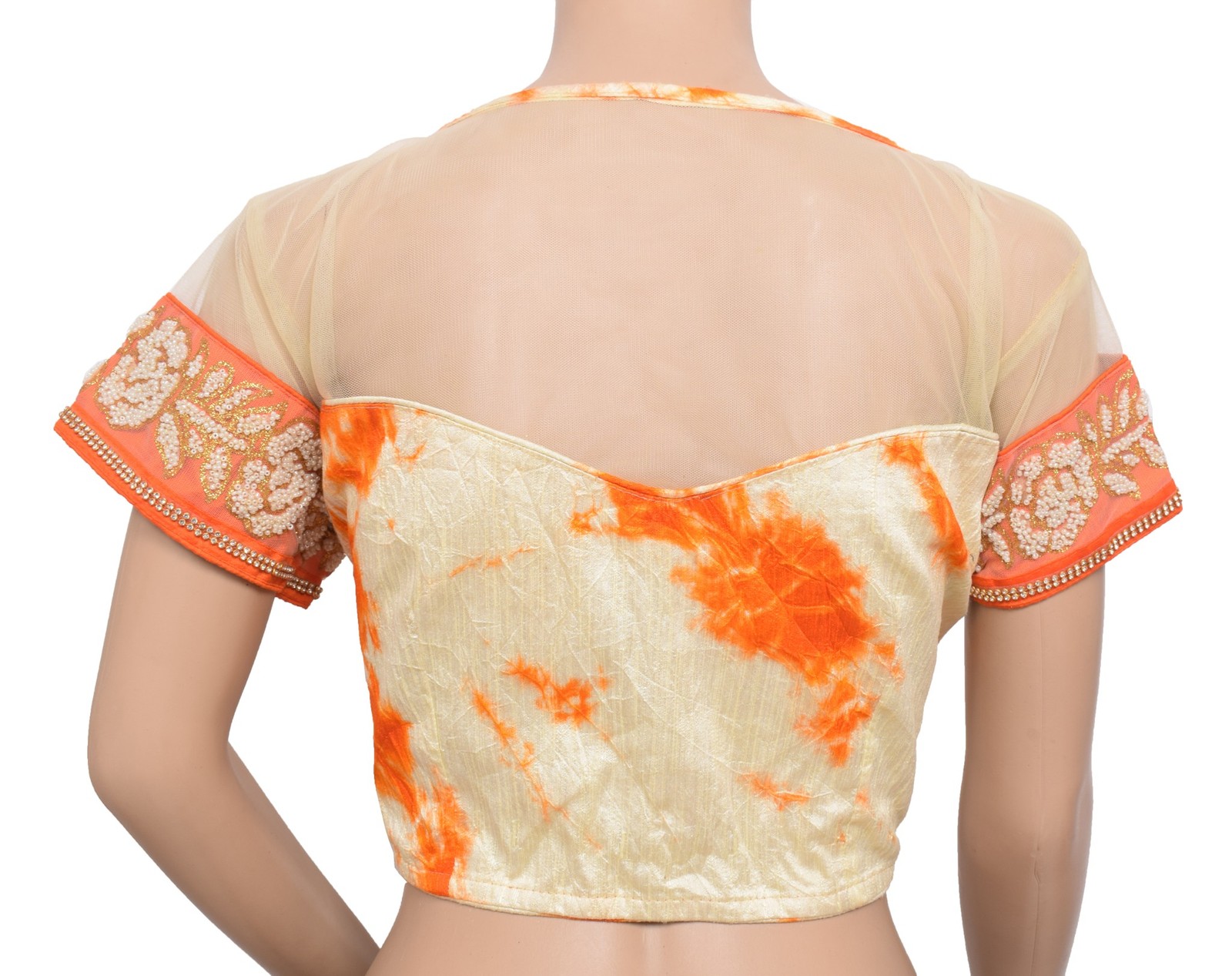 Sushila Vintage Batik Print Saree blouse Cream and orange Designer Silk Top 38