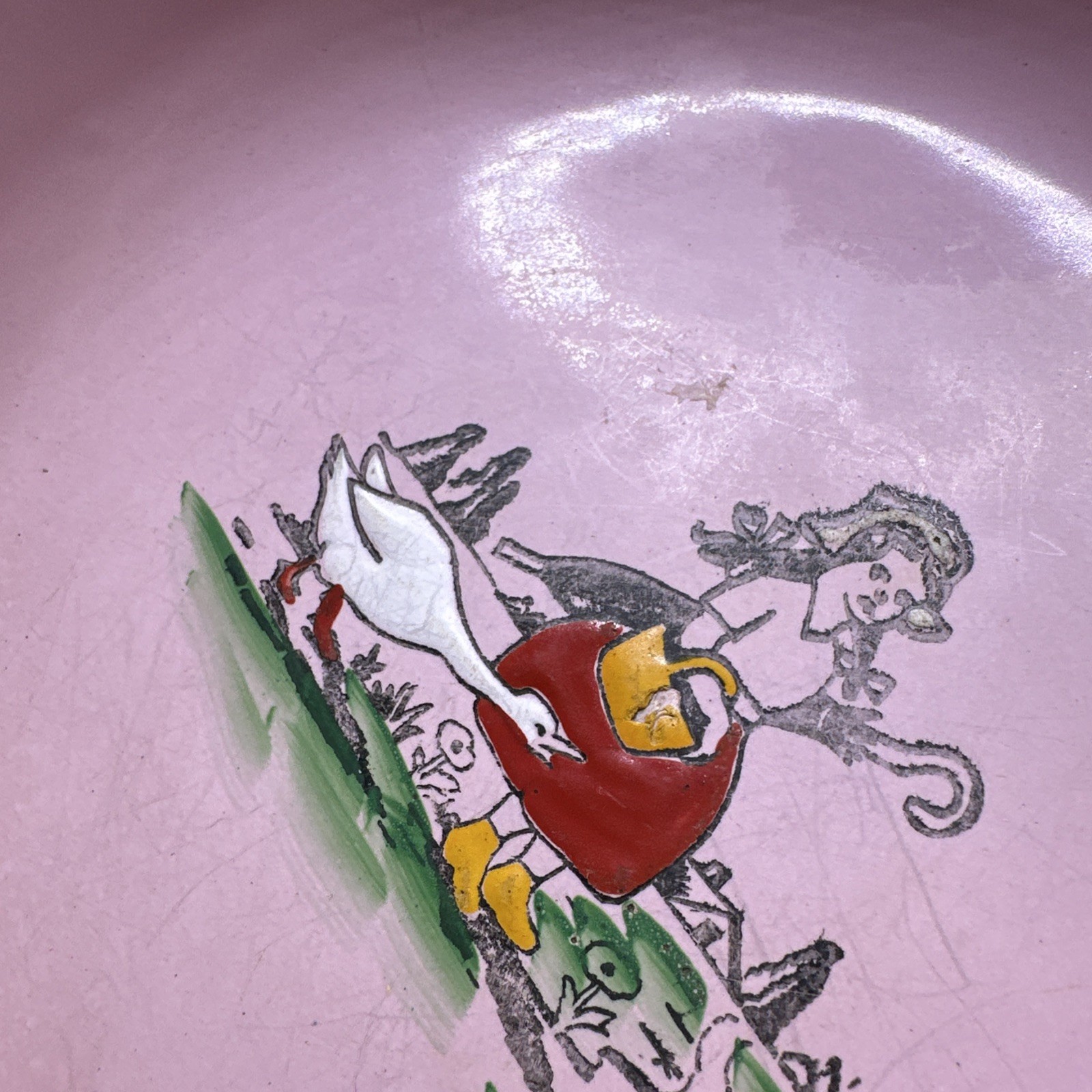 как выглядит Antique Enamelware Pink Baby Child s Feeding Bowl Dish Large Girl Goose Germany фото