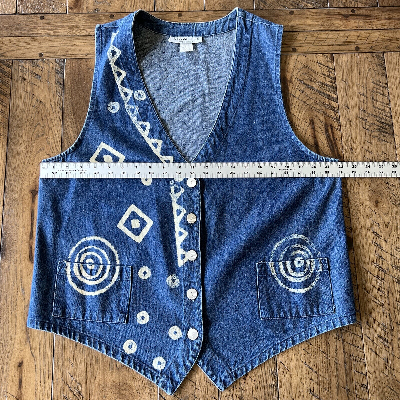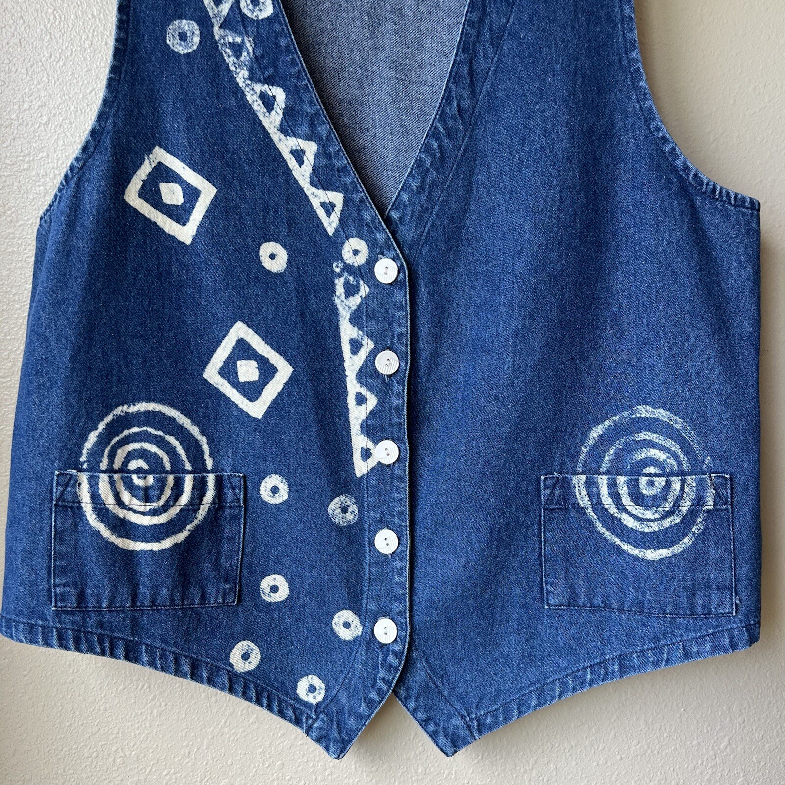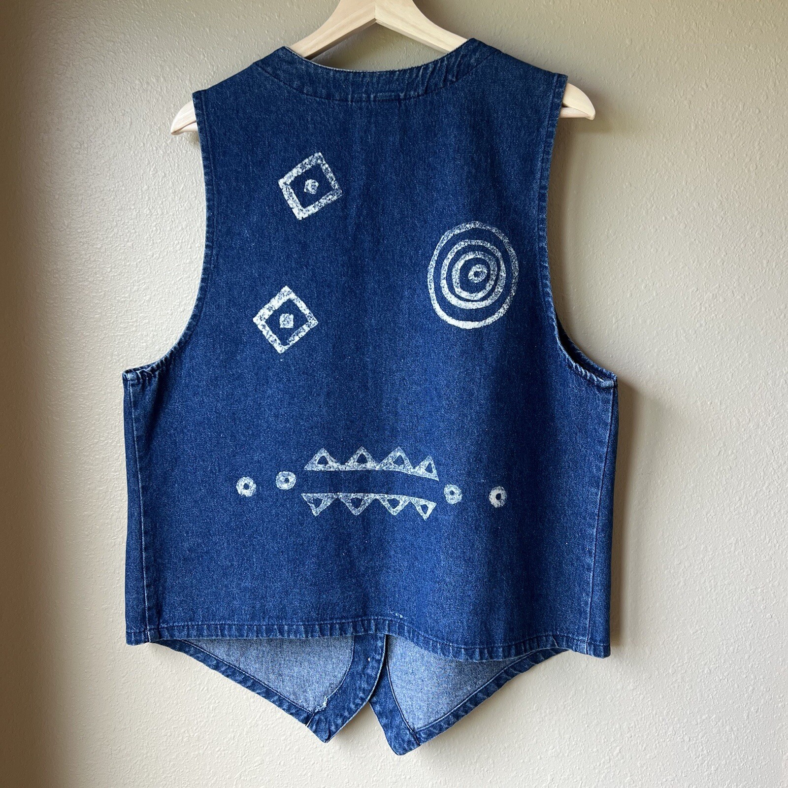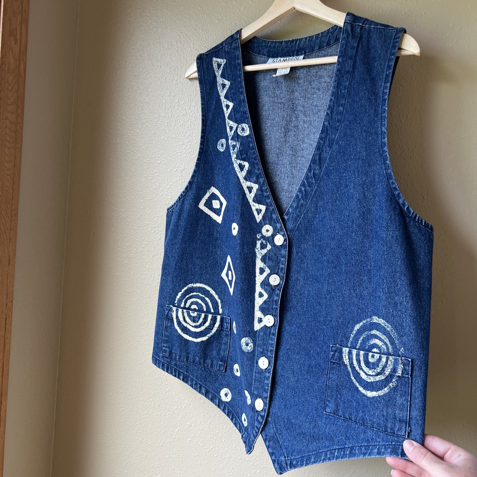 VTG Denim Vest Stampede Women s Size L USA Made 80 s 90s Boho Bleached Designs