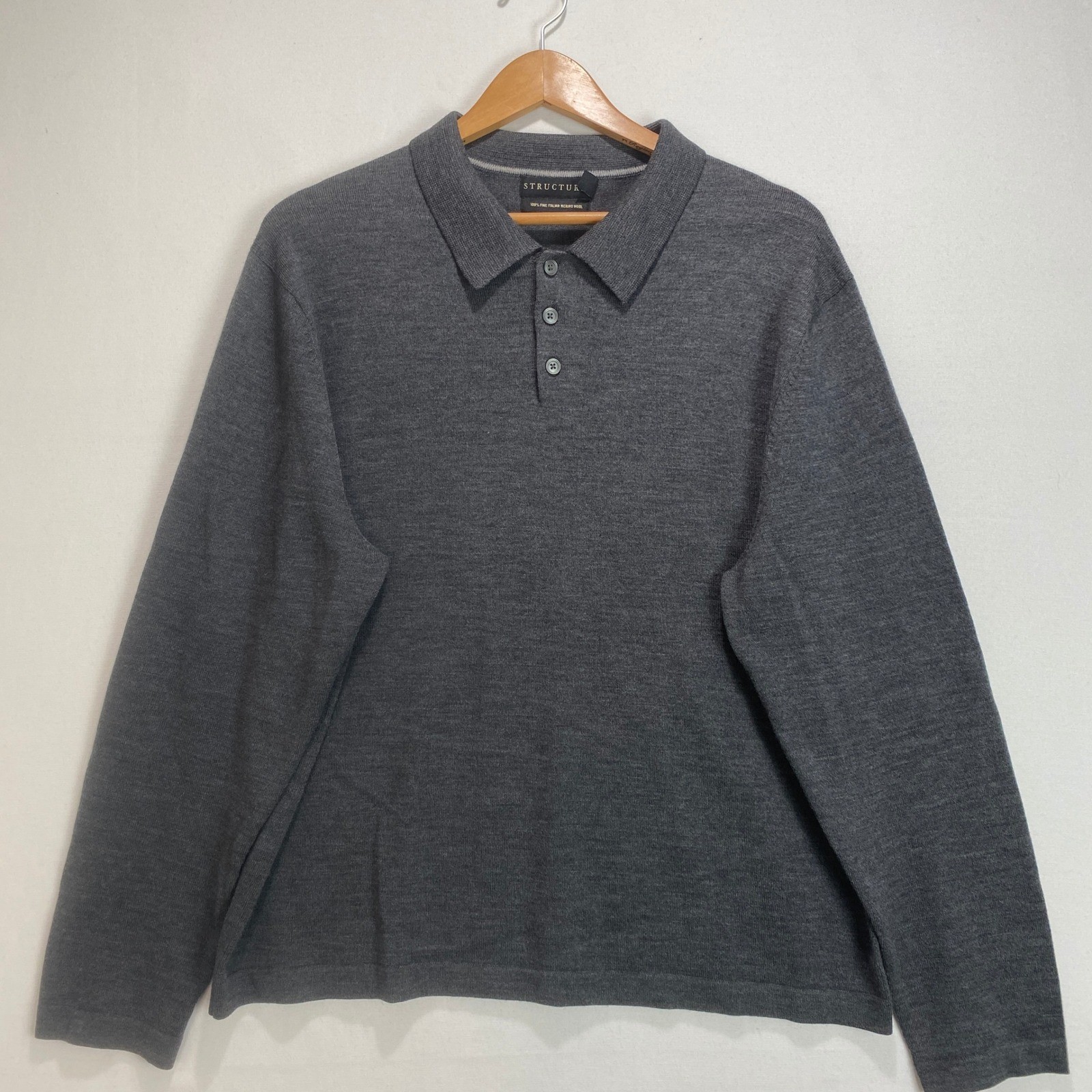 STRUCTURE Mens Dark Gray Long Sleeve Merino Wool Polo Shirt XL
