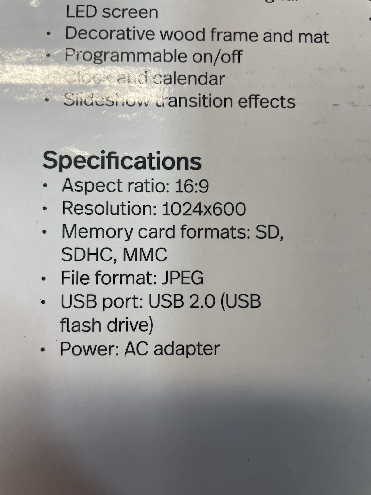 Особенности: Programmable Auto On/Off, Clock and Calendar, Slideshow transition effects, Decorative wood frame and mat, Easy to use