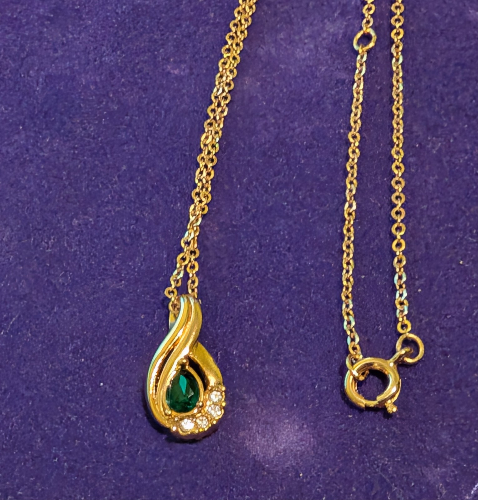 Gold Tone Necklace with Simulated Emerald and Diamonds Pendant 18 inches