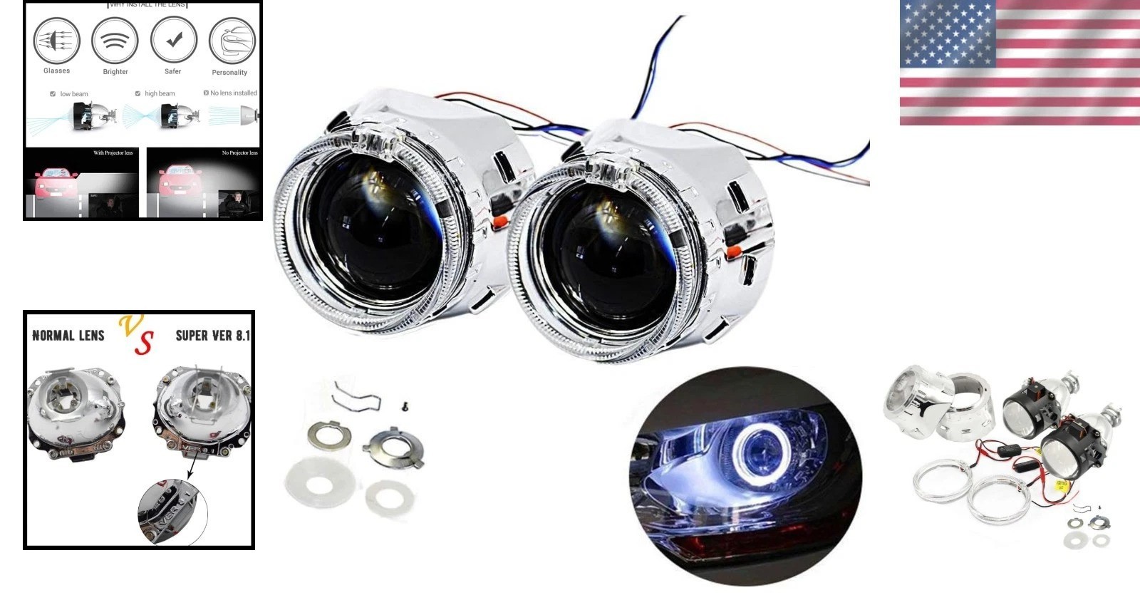 Особенности: Hi/Lo Beam Function, White Angel Eyes Decoration, Halo Rings, DRL Function, Chrome Shrouds Mask, Integrated Design, High Lumen LED, Clearer Aiming Lens, Wider Cut Off Line, No Blind Opposite Driver, Good Quality Abs Shrouds, Japan Made Motor, 300,000 Hrs Lifespan, Quad Retrofit Compatible