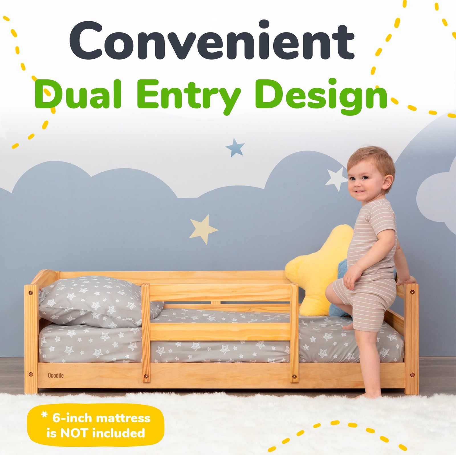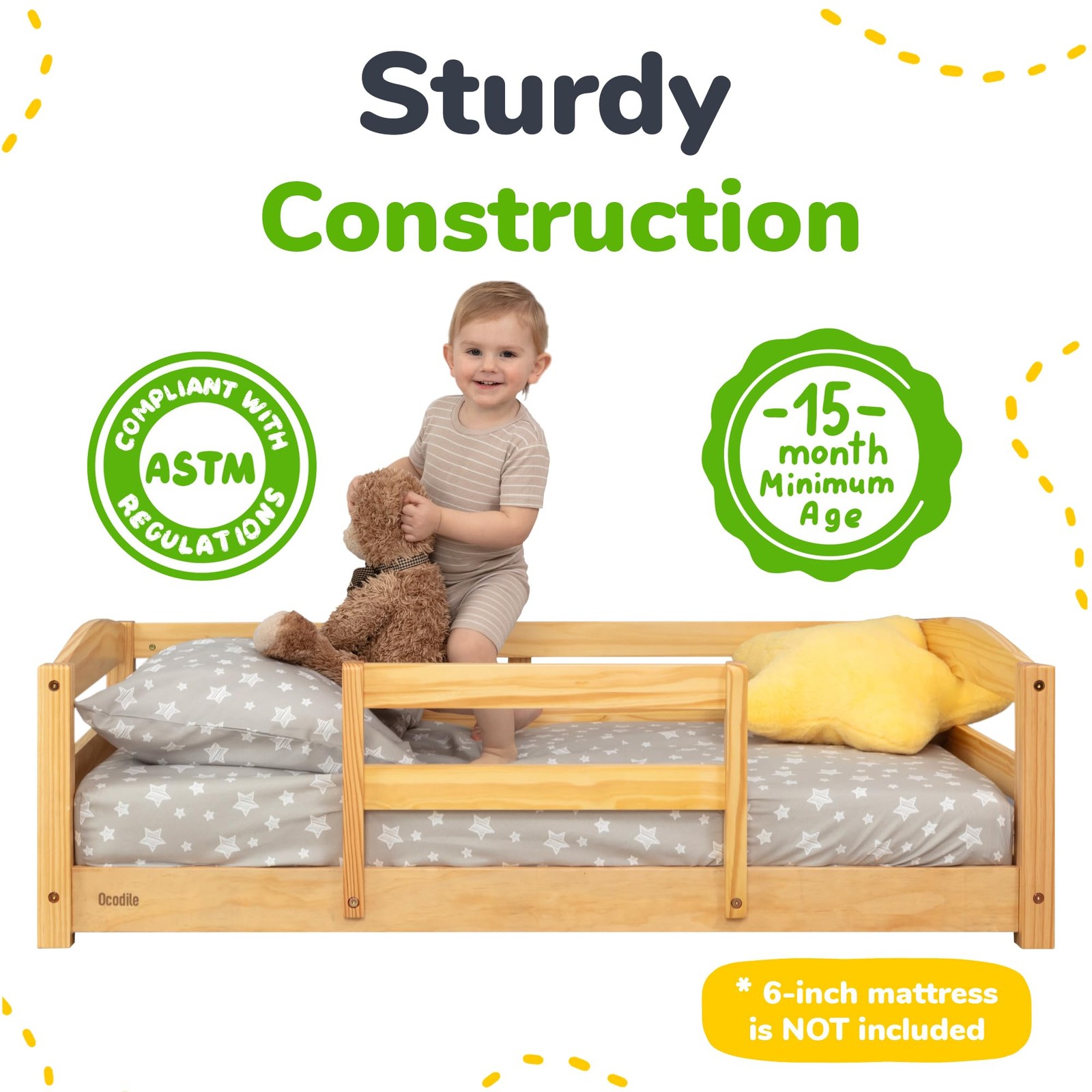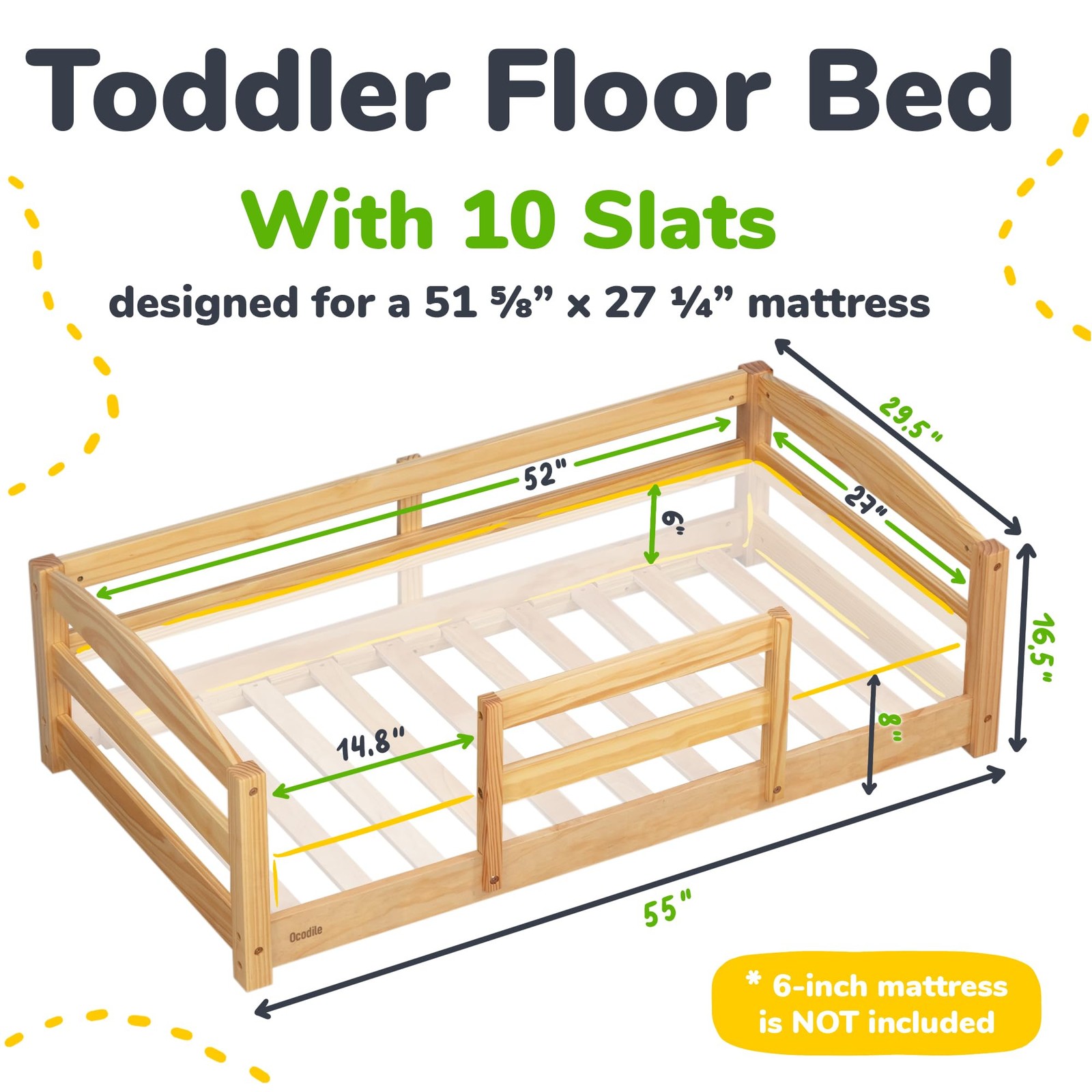 Toddler Bed with Rails Standard Crib Size Wooden Frame Varnished 1-3 Ocodile