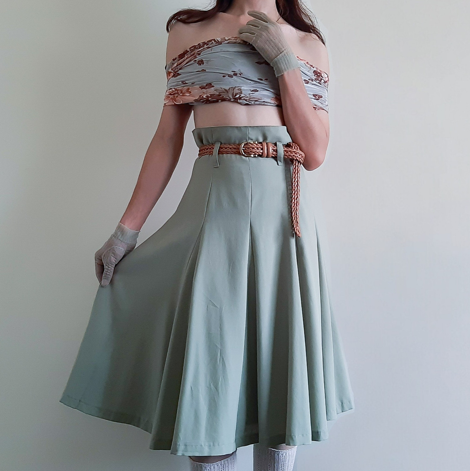 как выглядит 1970s Sage Green Wool Skirt High Waist Pleated Midi Elegant Minimal Japan S-M фото