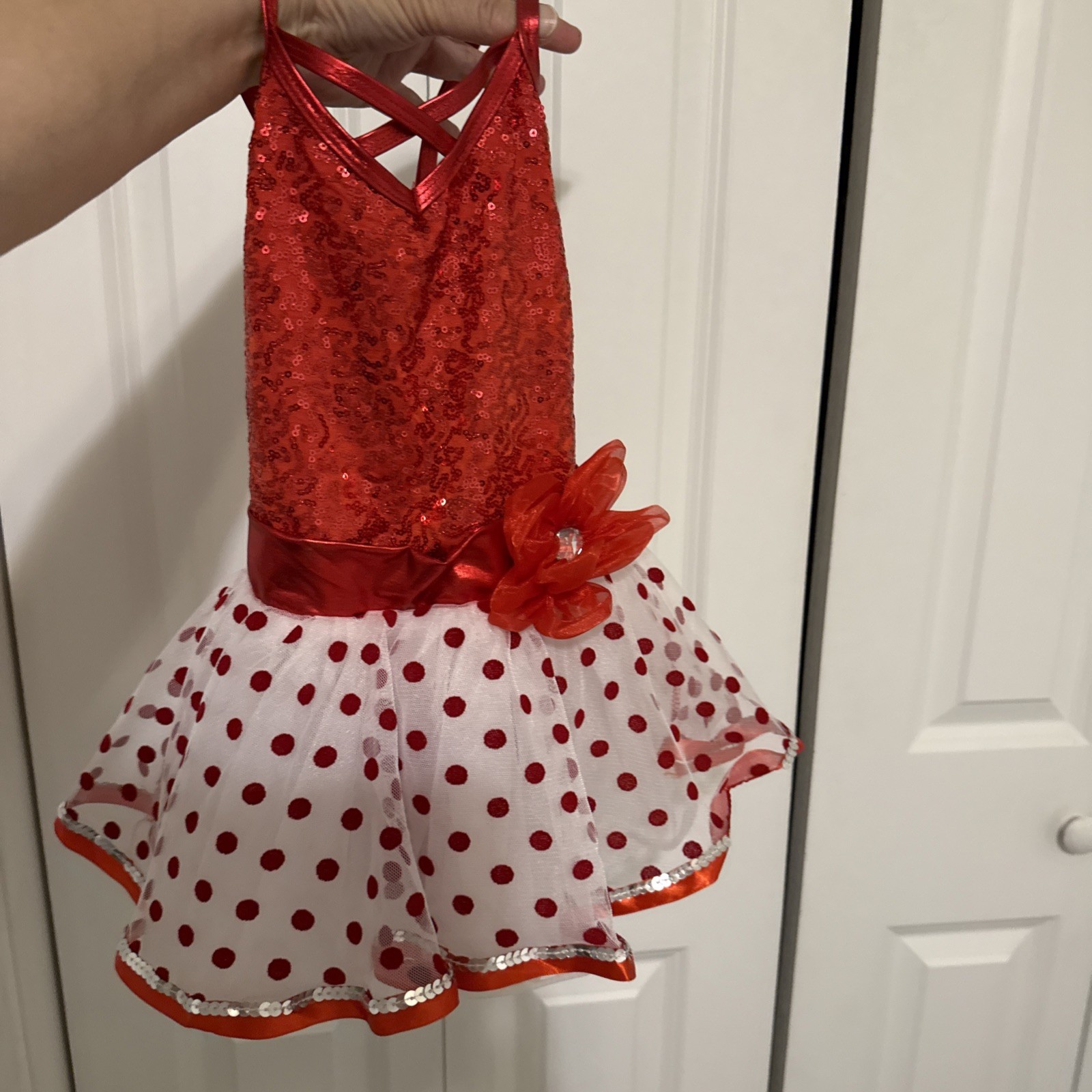 как выглядит Laylas Girls SC-Child Red White Polka Dots With Sequins Dance Costume Outfit фото
