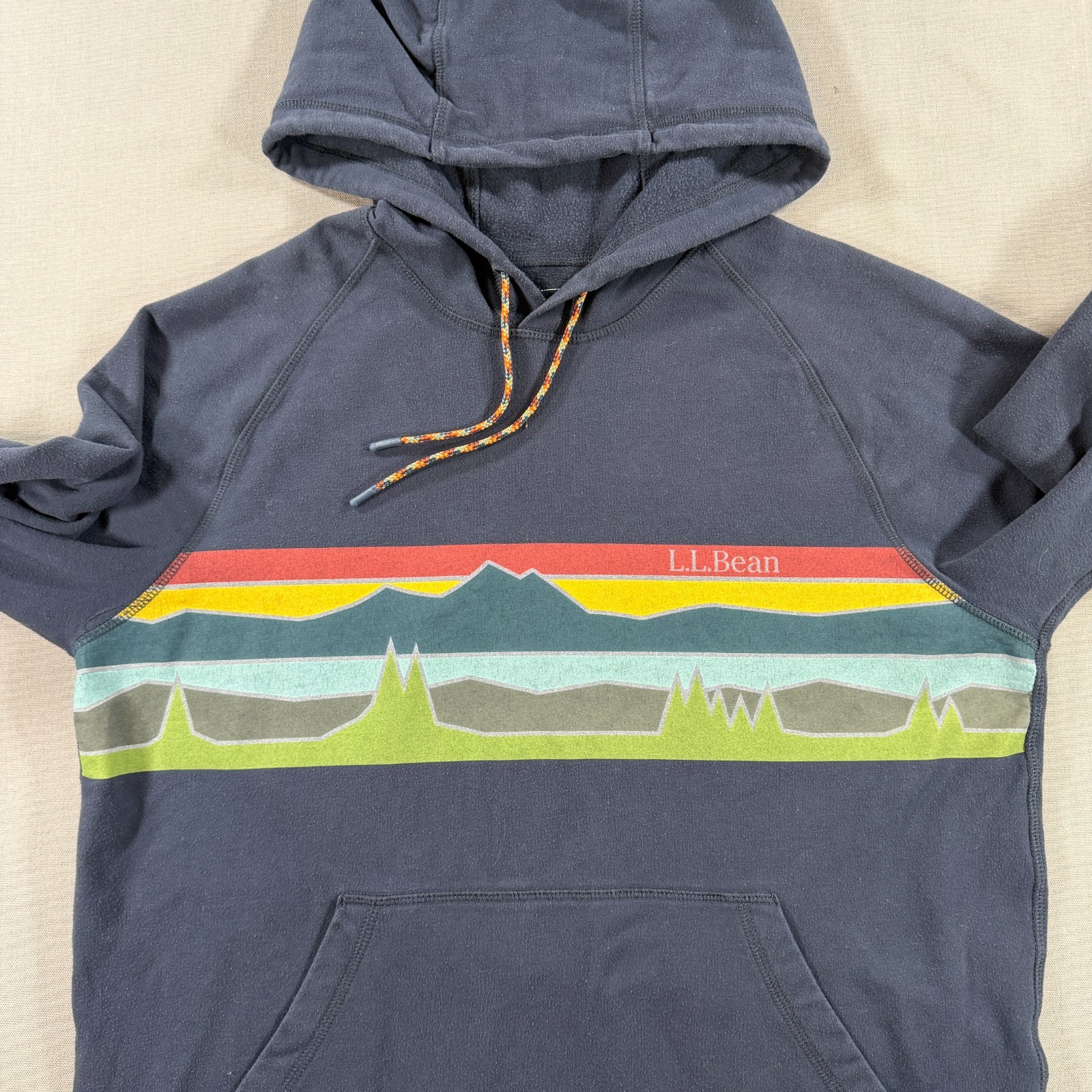 как выглядит LL Bean Comfort Camp Hoodie Mens Medium Blue Fleece Pullover Sweatshirt Graphic фото