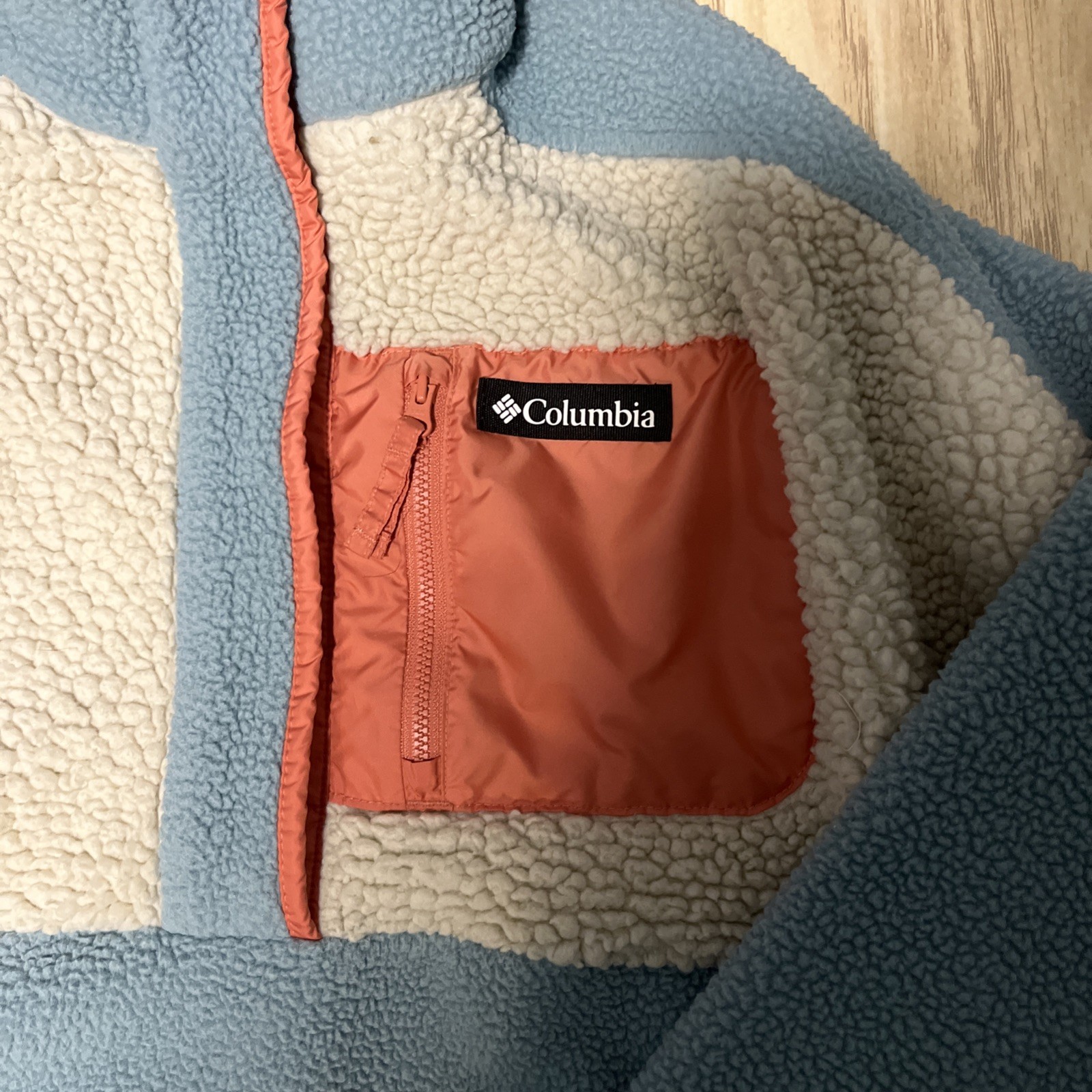 как выглядит Columbia Sherpa Fleece Pullover Jacket White blue orange 1/4 Button Up Kids Med фото