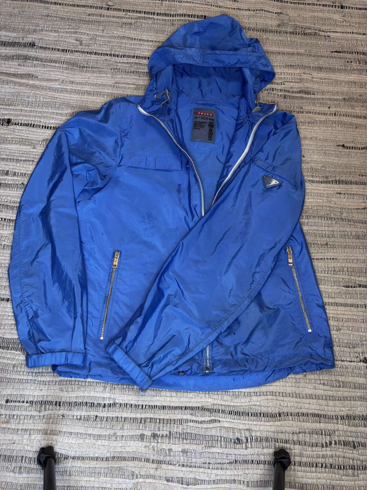 Prada Blue Hooded Windbreaker Jacket Men Full Zip Logo Zipper Casual