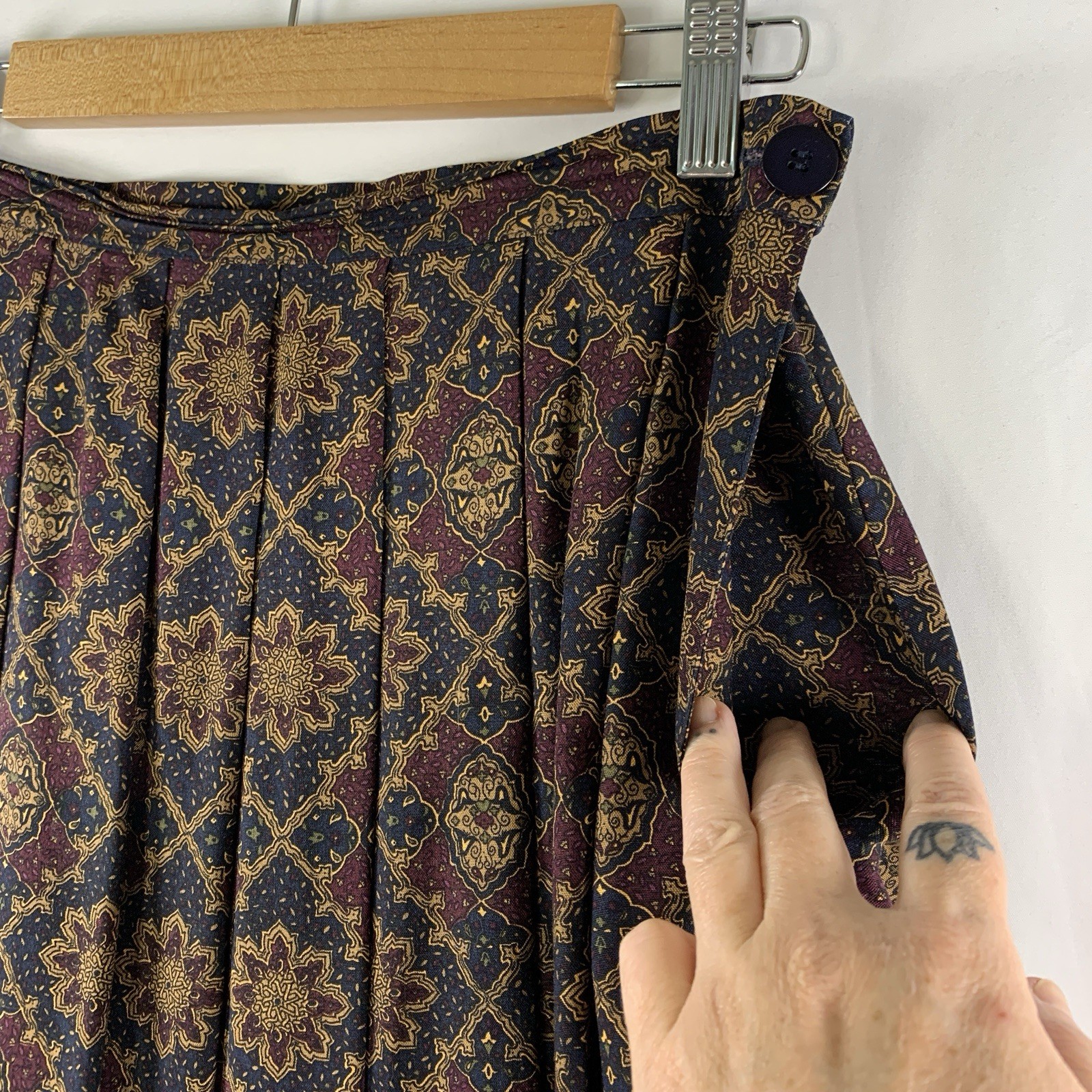VTG Womens Paisley Pleated Midi Skirt Sz M Petite Academia Artsy Boho Rayon USA
