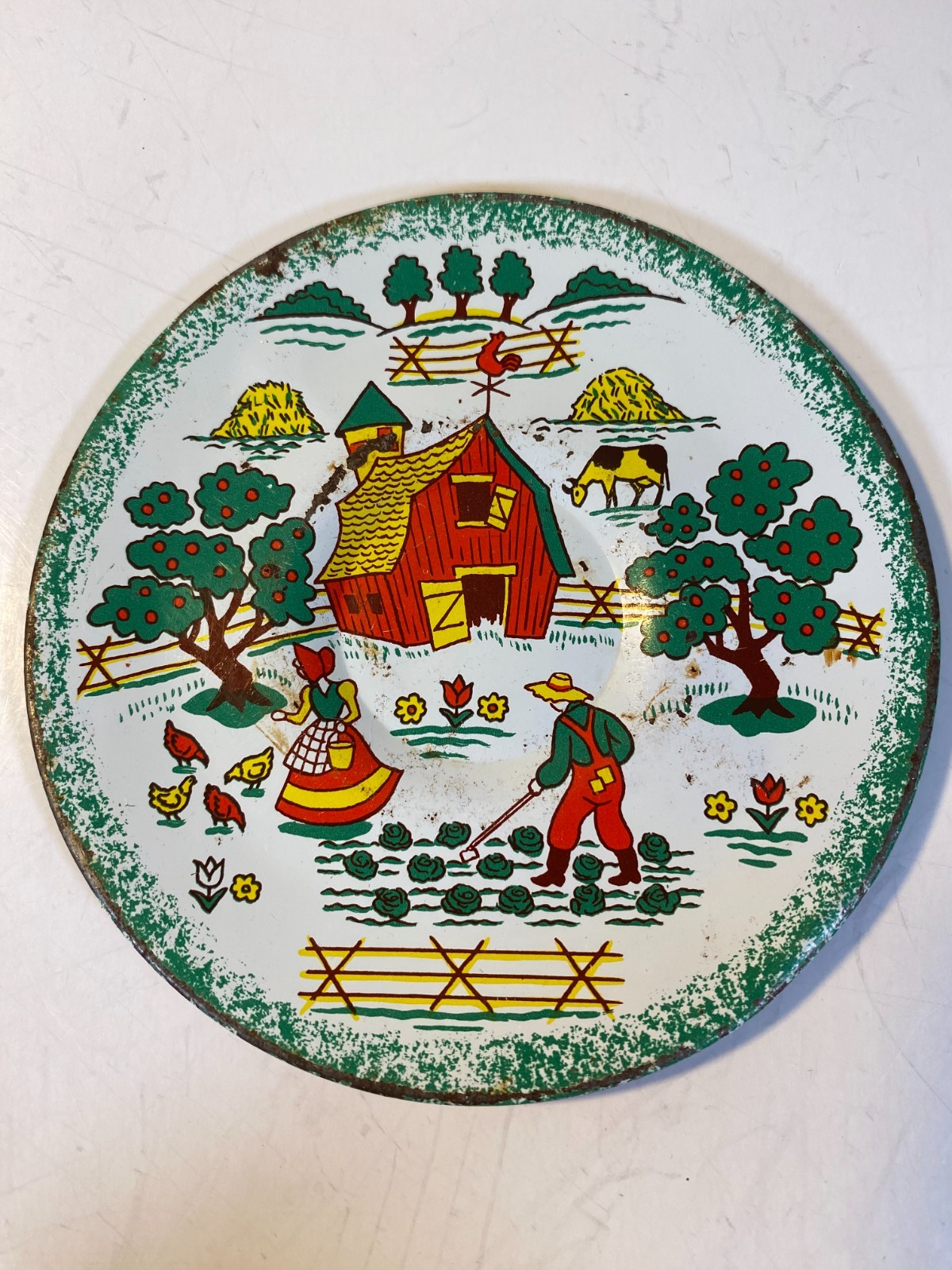 Vintage Ohio Art Tin Litho Tea Set Apple Farm Country Charm Piece 3 Plates Flaws