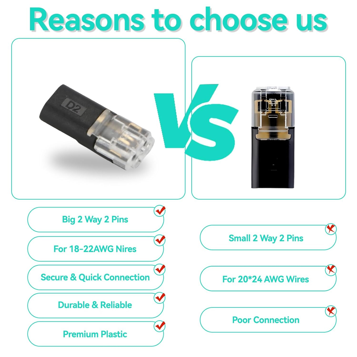 100Pcs Double Wire Plug in Connector, 2-Pin Low Voltage Wire Connectors with Loc