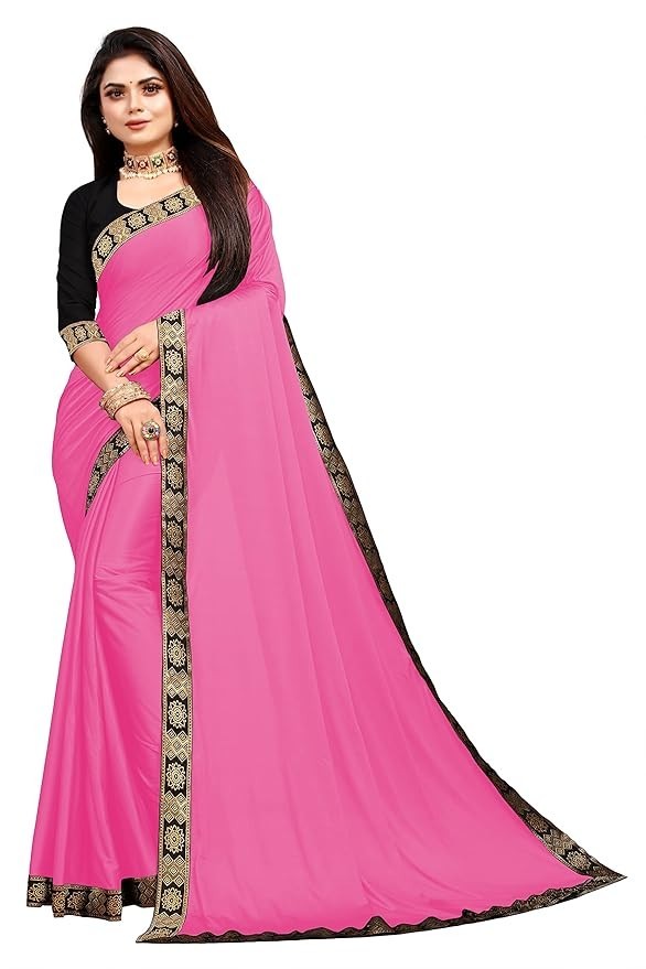 Women's Lycra Plain Jacquard Lace Border Gorgeous Saree with Blouse Piece PINK