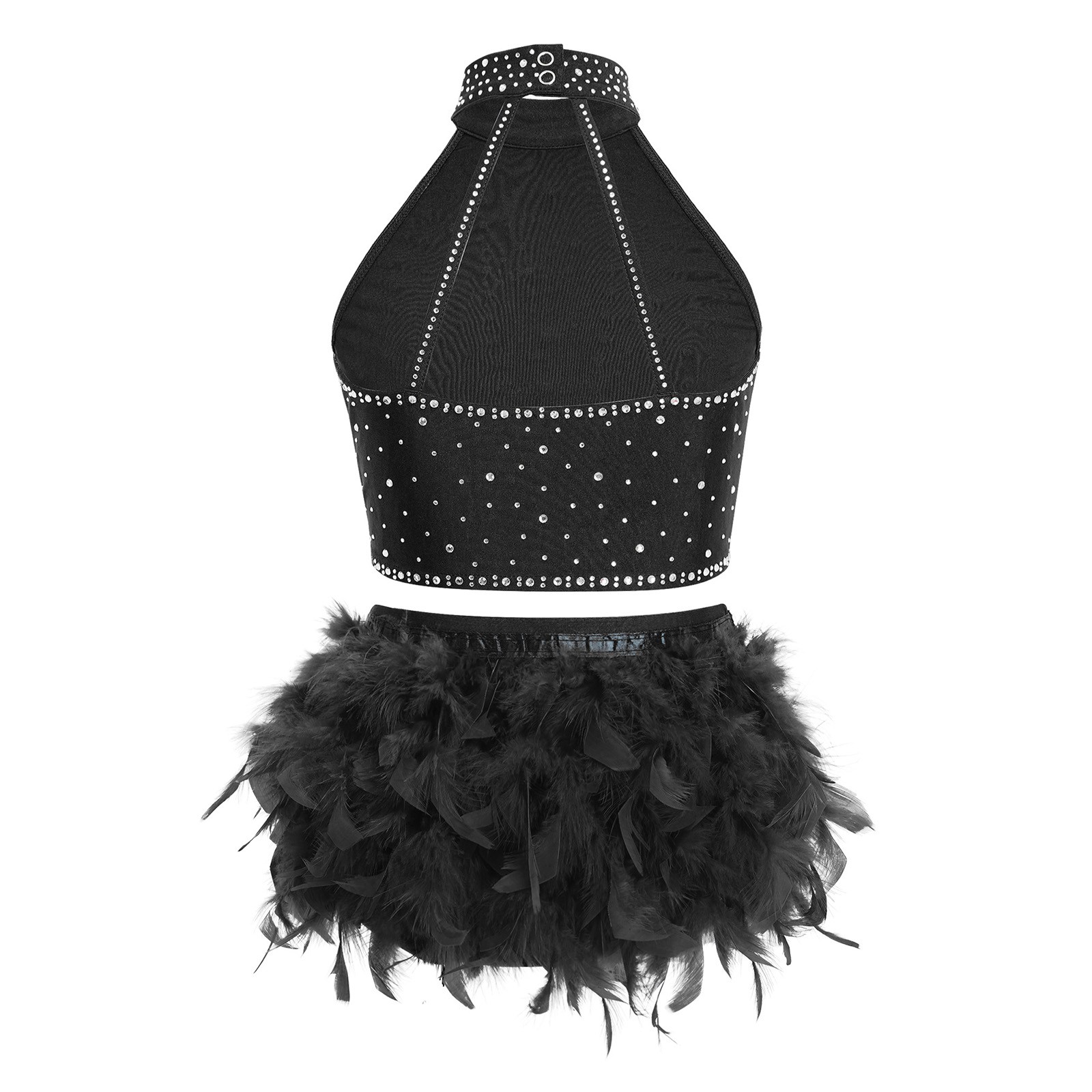 Girls Crop Top Cha-Cha Feather Fringe Skirt Stage Latin Dance Sleeveless Samba