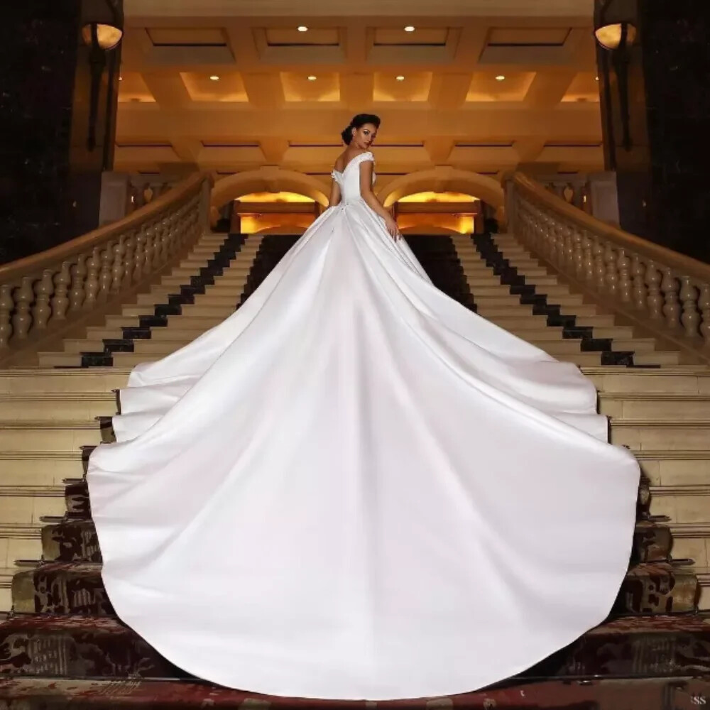 Bridal Gowns Satin Silky Train Wedding Dresses Off Shoulder Sweetheart Neck Back