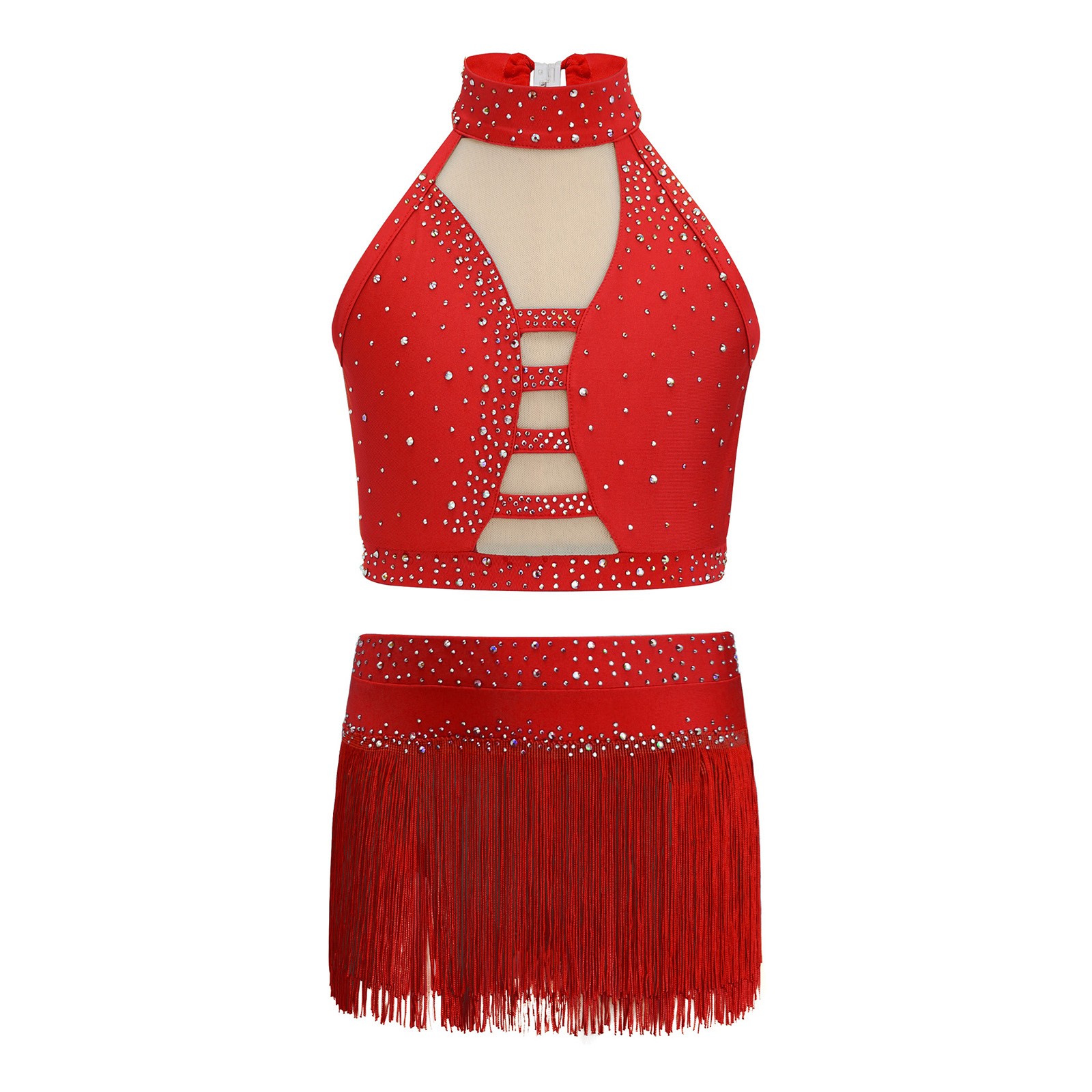 как выглядит Girls Latin Dance Rumba Fringe Skirt Party Dance Outfits Stage Mesh Patchwork фото