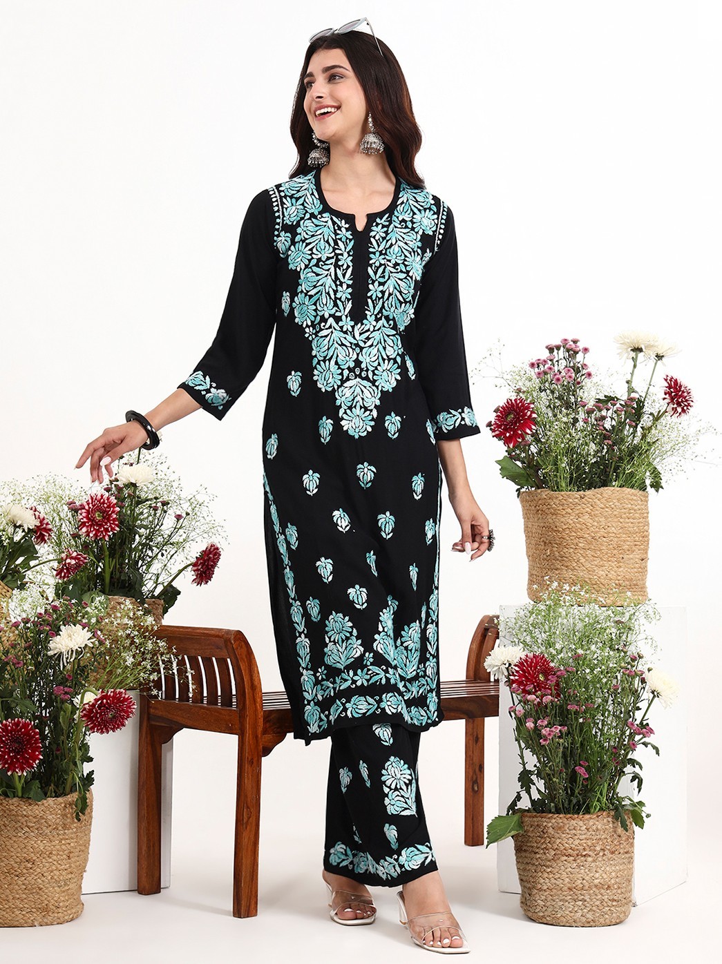 как выглядит Green Rayon Chikankari Kurta Set Lucknow Chikankari Kurti Palazzo Salwar Kameez фото