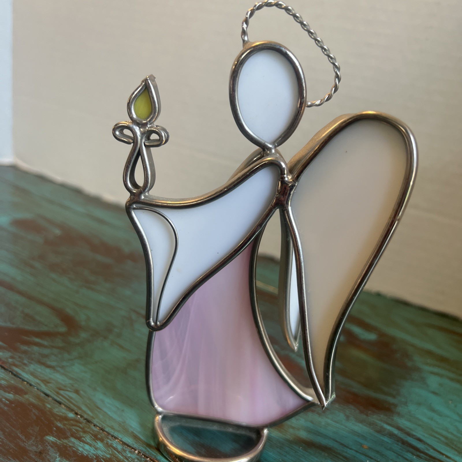 • STAINED GLASS pink ANGEL holding candle standing White Wings Side View