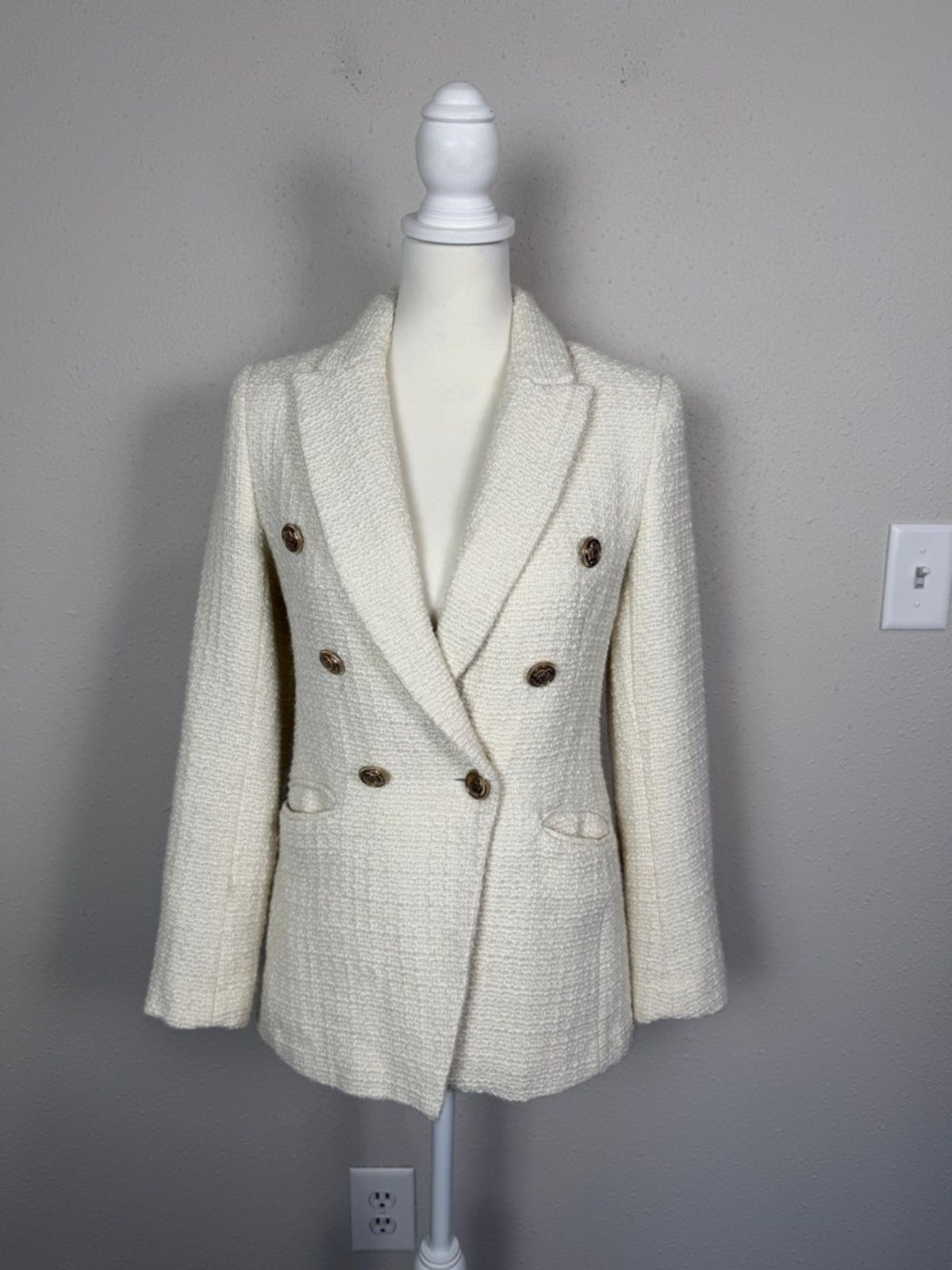 H M Cream Tweed Blazer Double Breasted Gold Button Jacket Textured Chic XS