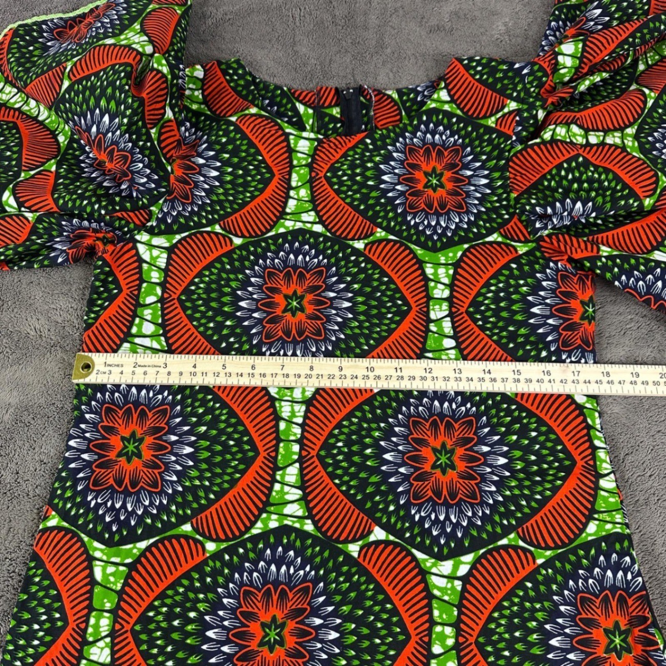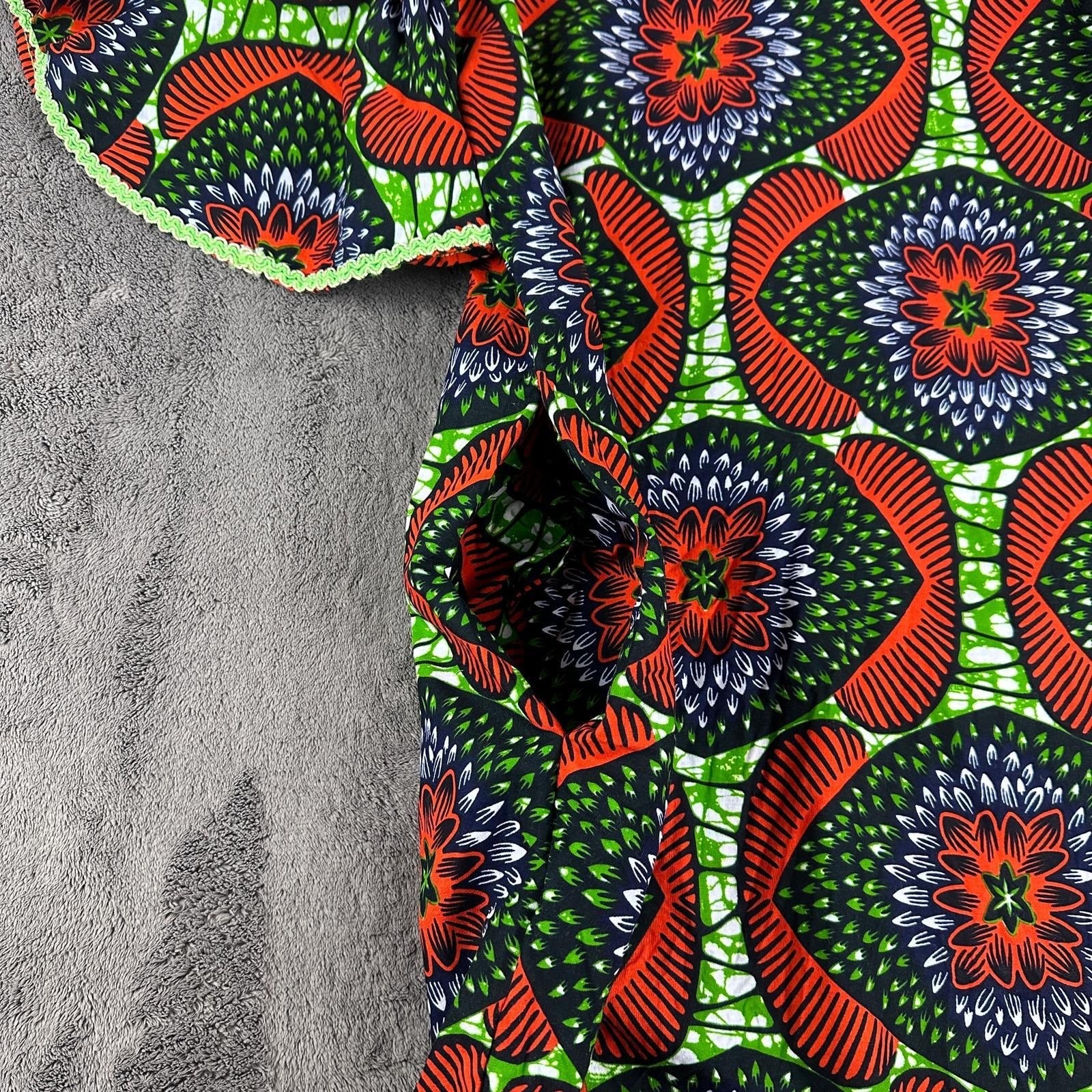 как выглядит African Wax Print Ankara Ruffle Sleeve Midi Dress Orange Green Geometric Pattern фото