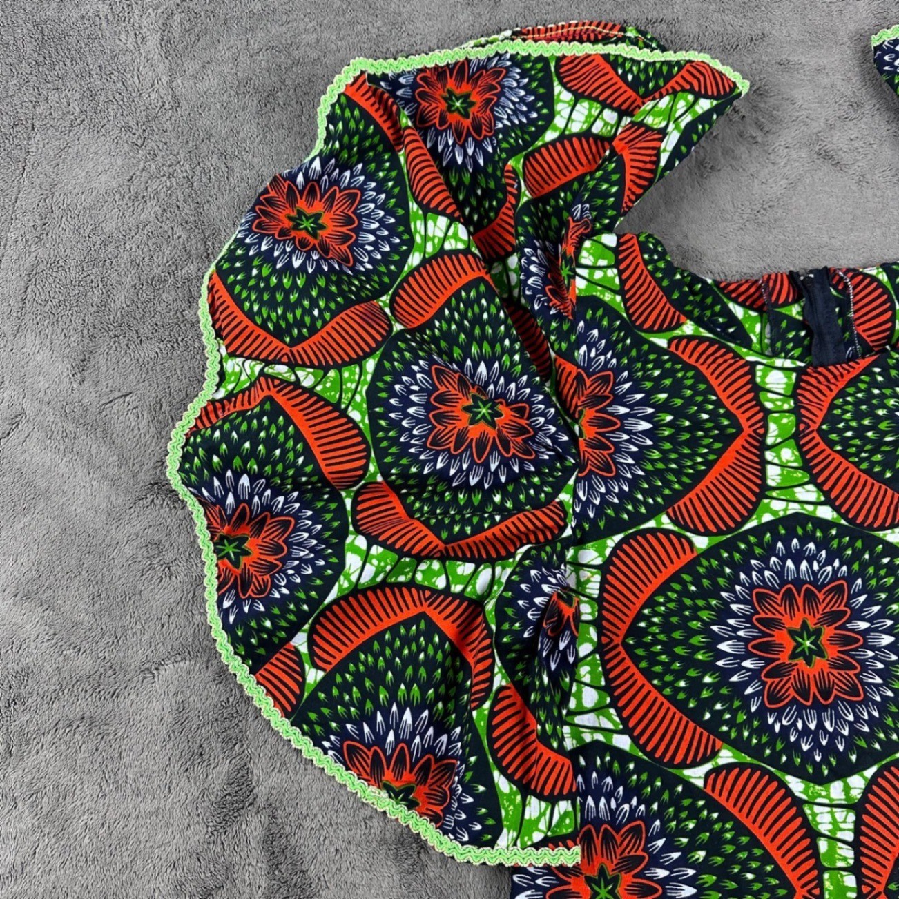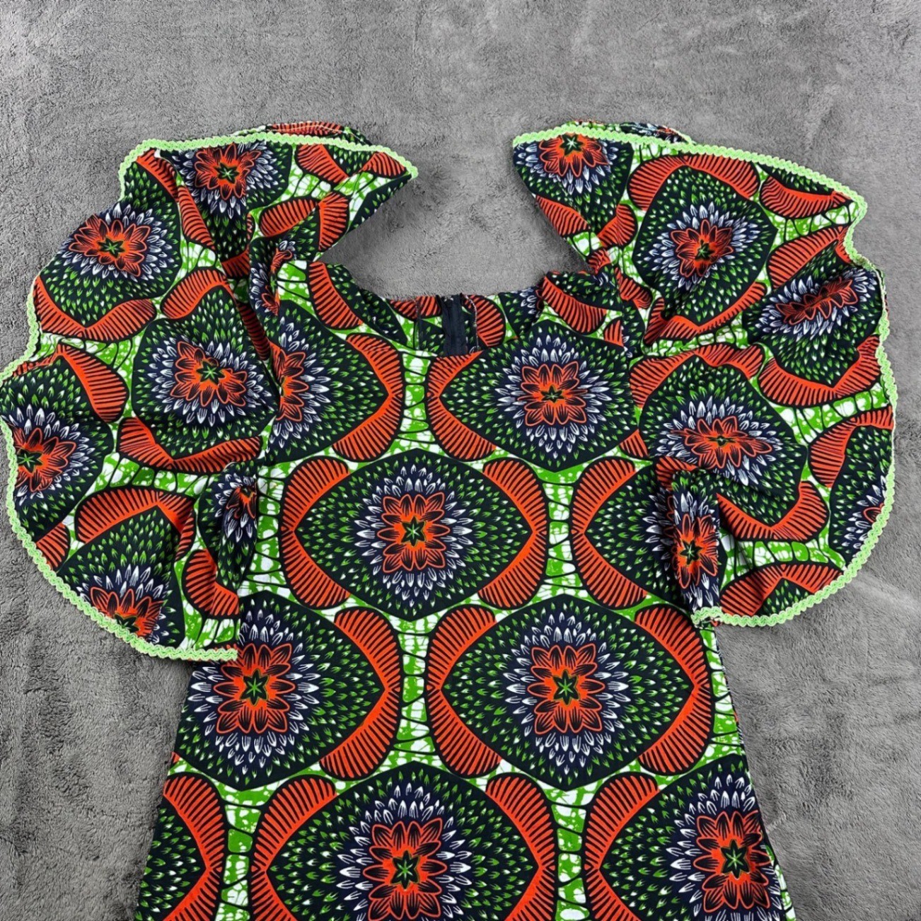 African Wax Print Ankara Ruffle Sleeve Midi Dress Orange Green Geometric Pattern