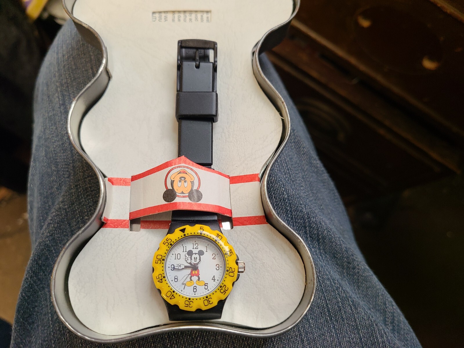 как выглядит Vintage Disney Time Works Yellow and Black Mickey Mouse Watch In Tin фото