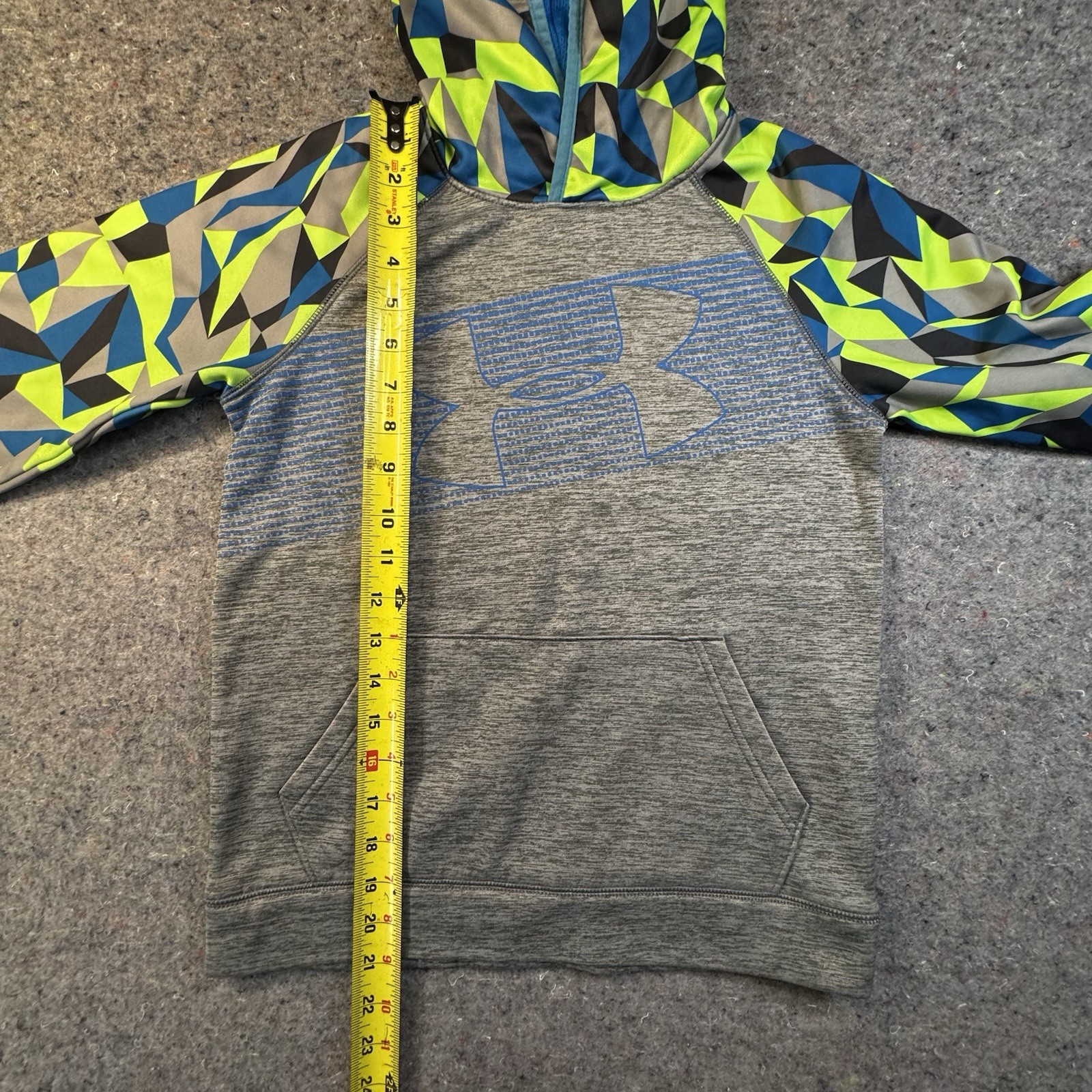 как выглядит Under Armour Boys Hoodie Gray Blue Pullover ColdGear Loose Fit M Geometric -323 фото