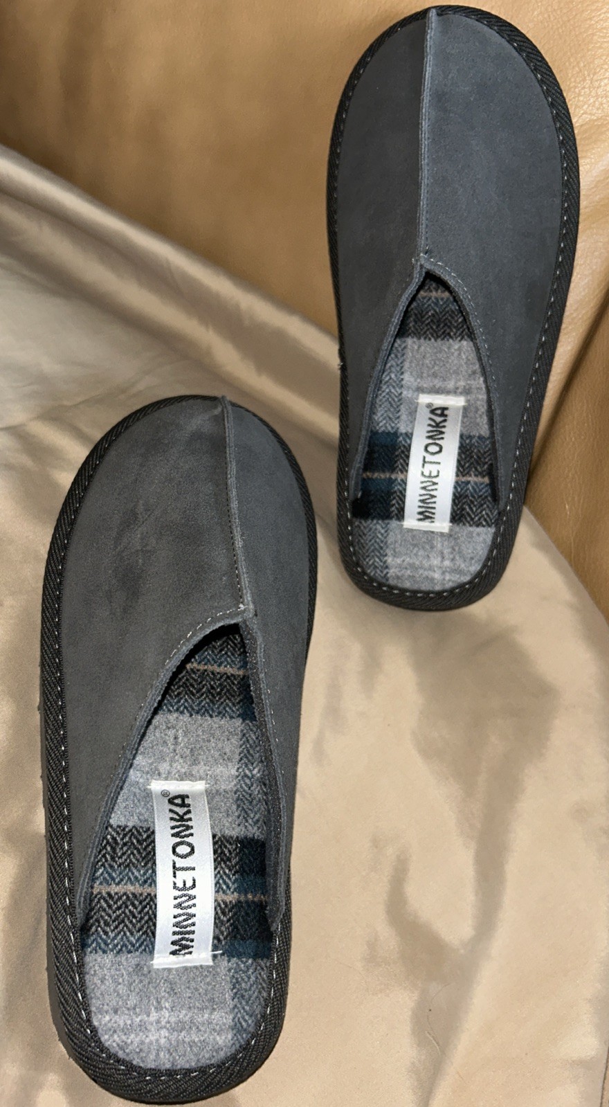 Minnetonka slip-on slippers Clog grey suede upper plaid lining NWOB SIZE 8