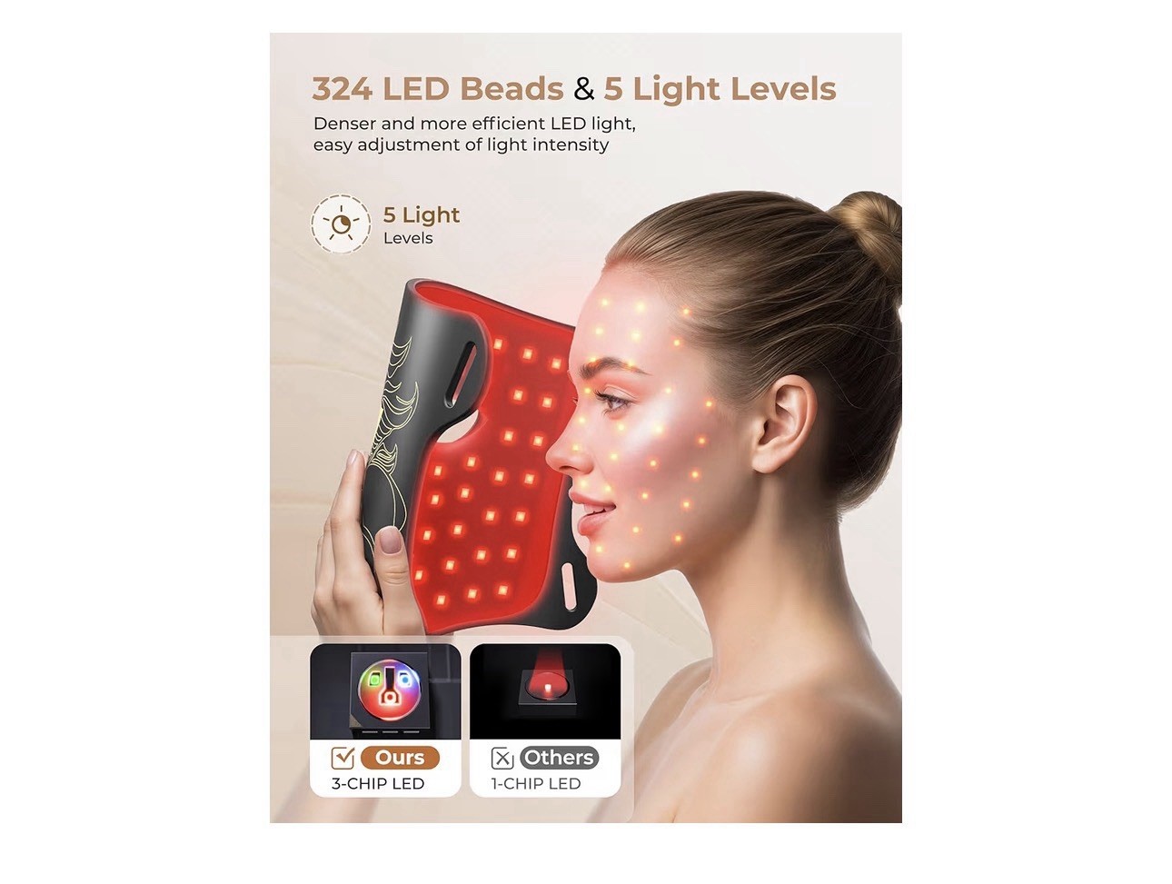 LED Light Therapy Mask for Face and Neck, 324 LEDs, 7 Colors, 5 Levels, Silicon