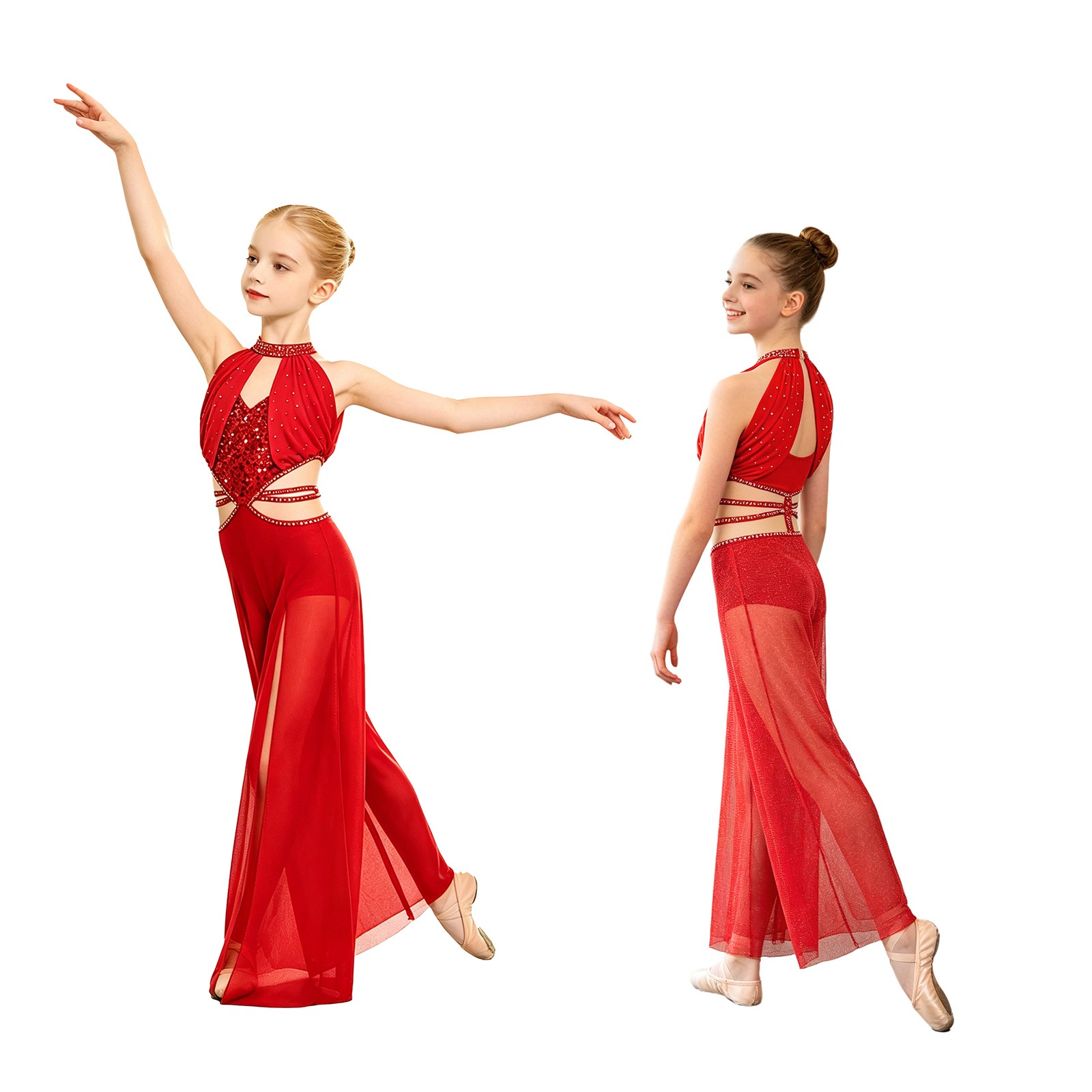как выглядит Kids Girls Lyrical Sleeveless Bodysuit Cutout Dancewear Patchwork Jumpsuit Mesh фото
