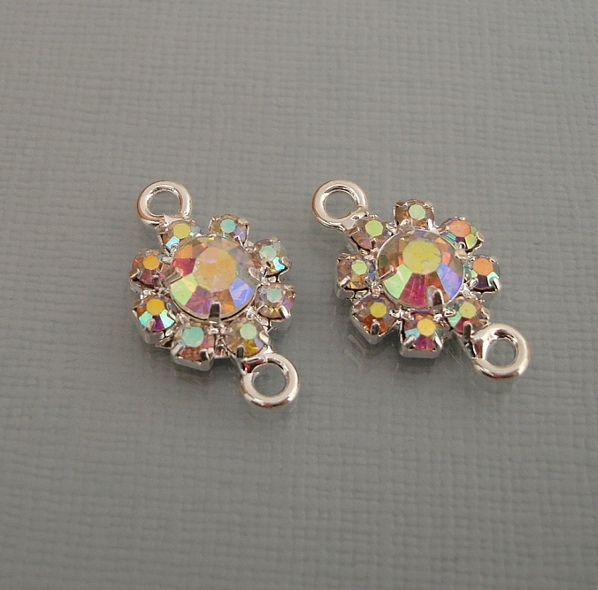 2pcs - Connector Charm Silver Brass AB Coated Crystal Rhinestones.