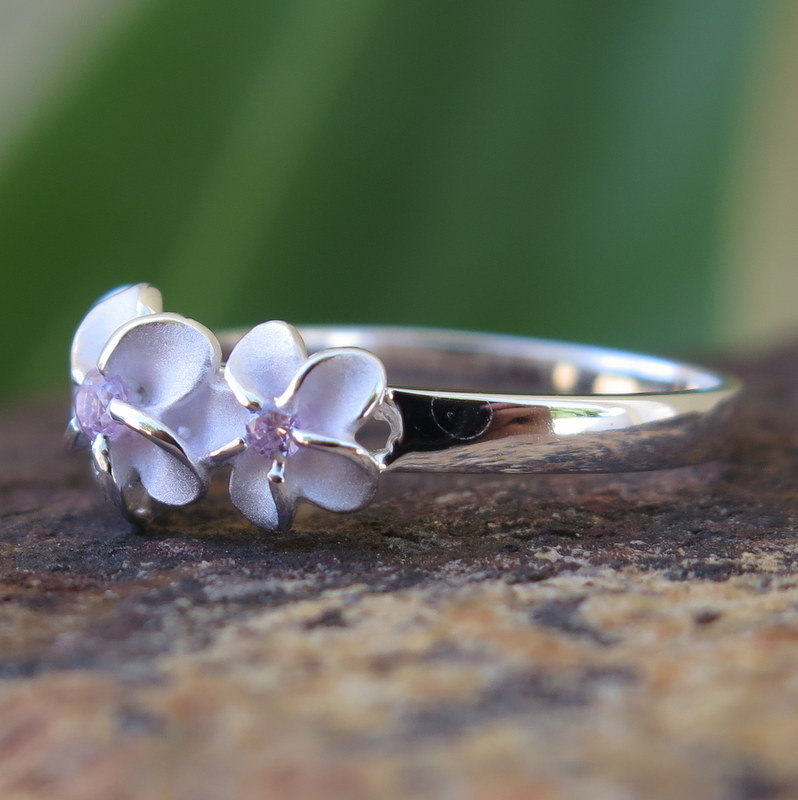 как выглядит Hawaiian 925K Silver Three Plumeria Flowers Pink CZ Wedding Ring Band 6mm SR2102 фото