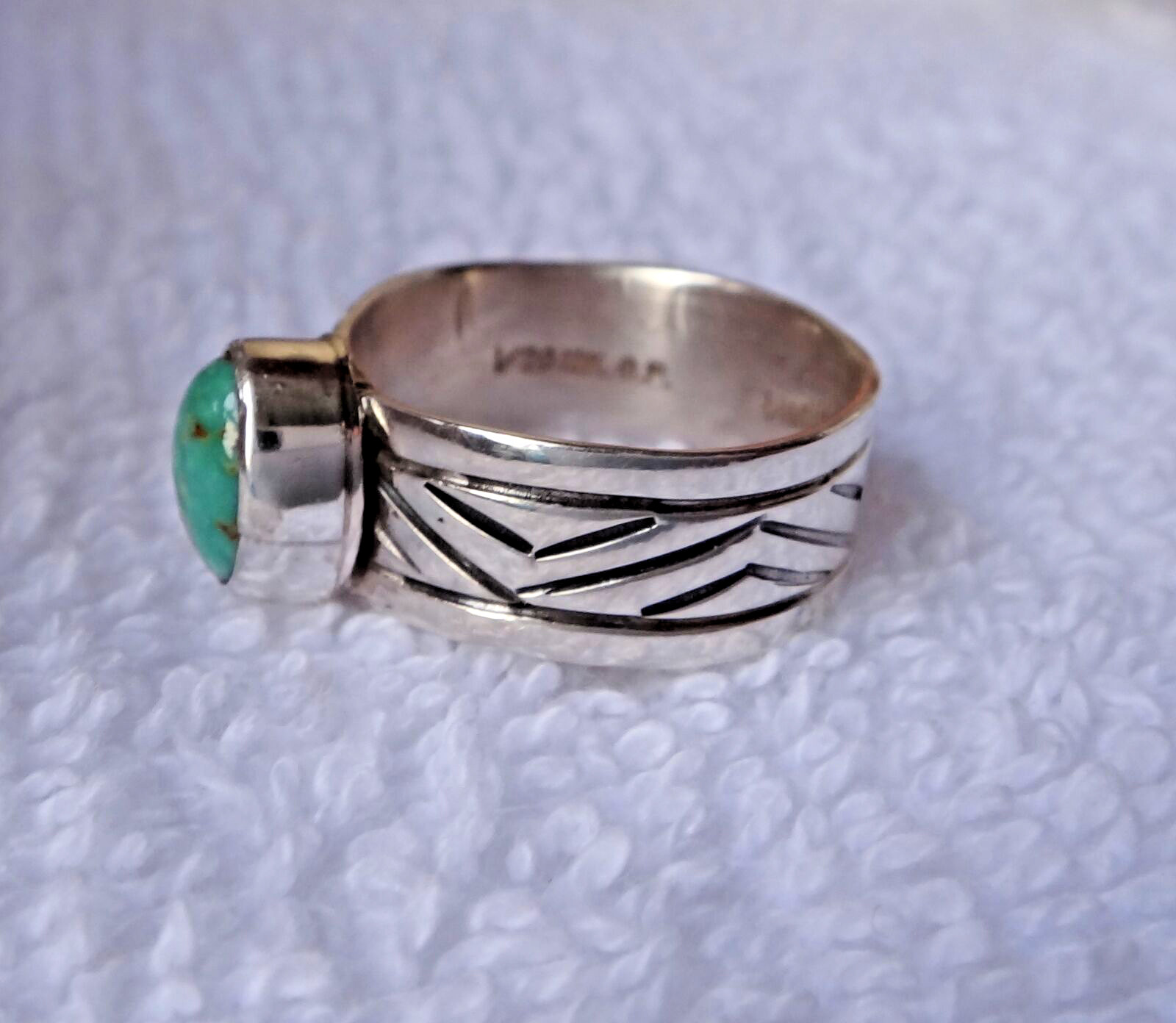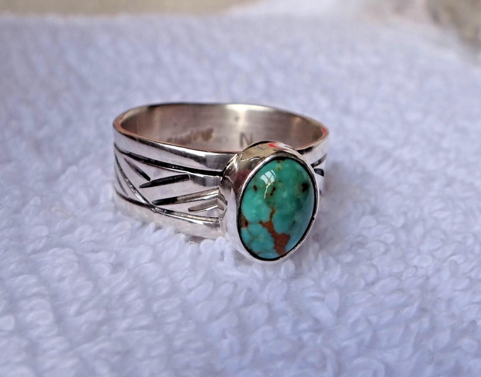 size 7 Sterling Silver 9x7mm oval Blue Turquoise 7mm wide decorative Band Ring