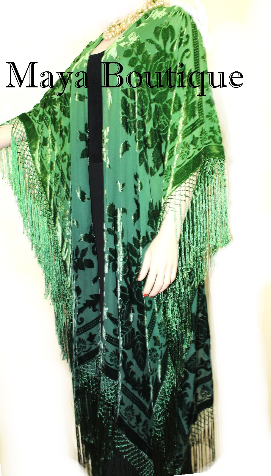 Green Wearable Art Kimono Caftan Fringe Jacket Burnout Velvet Hand Dyed Maya