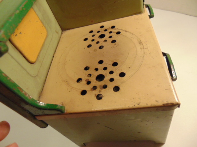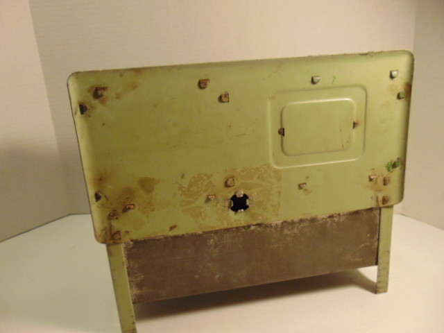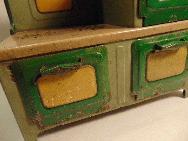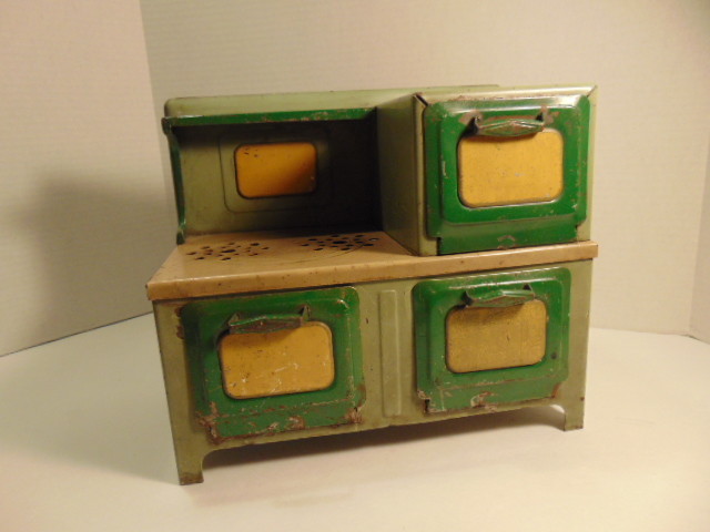 как выглядит Vintage toy green and tan colored metal stove фото