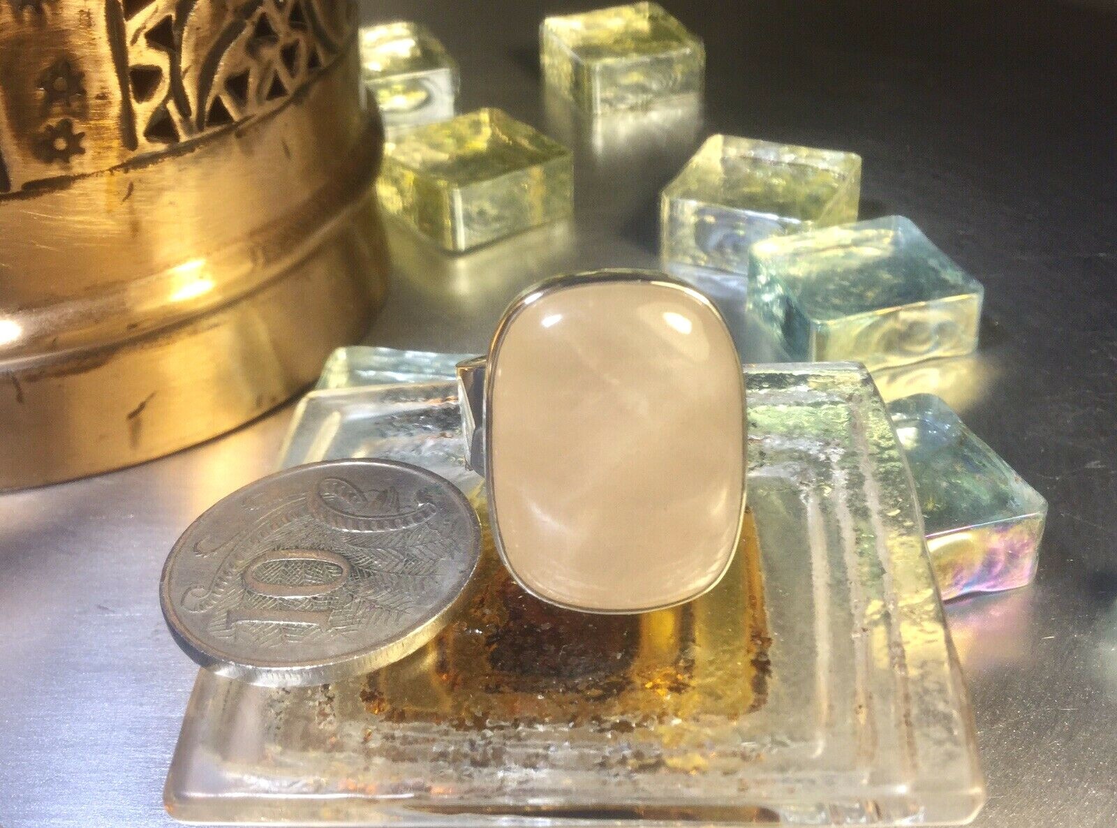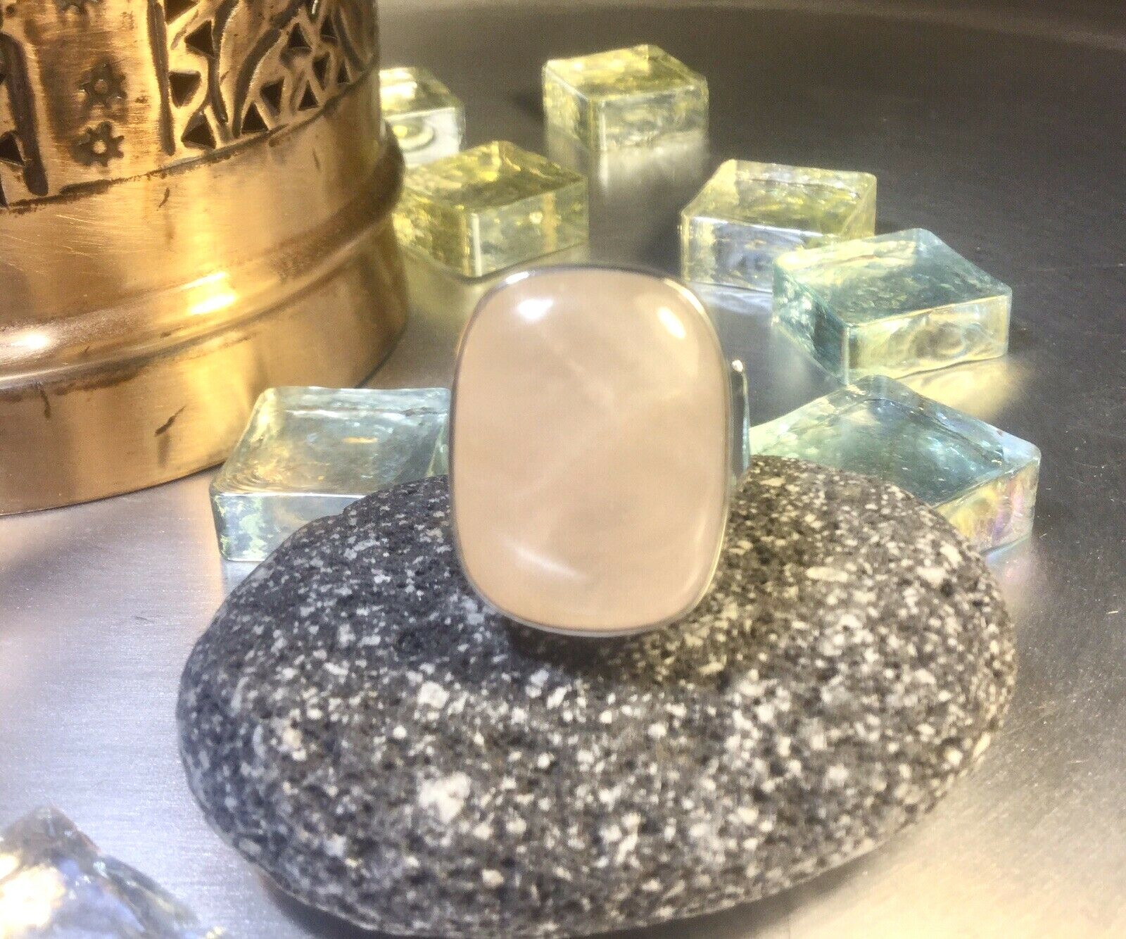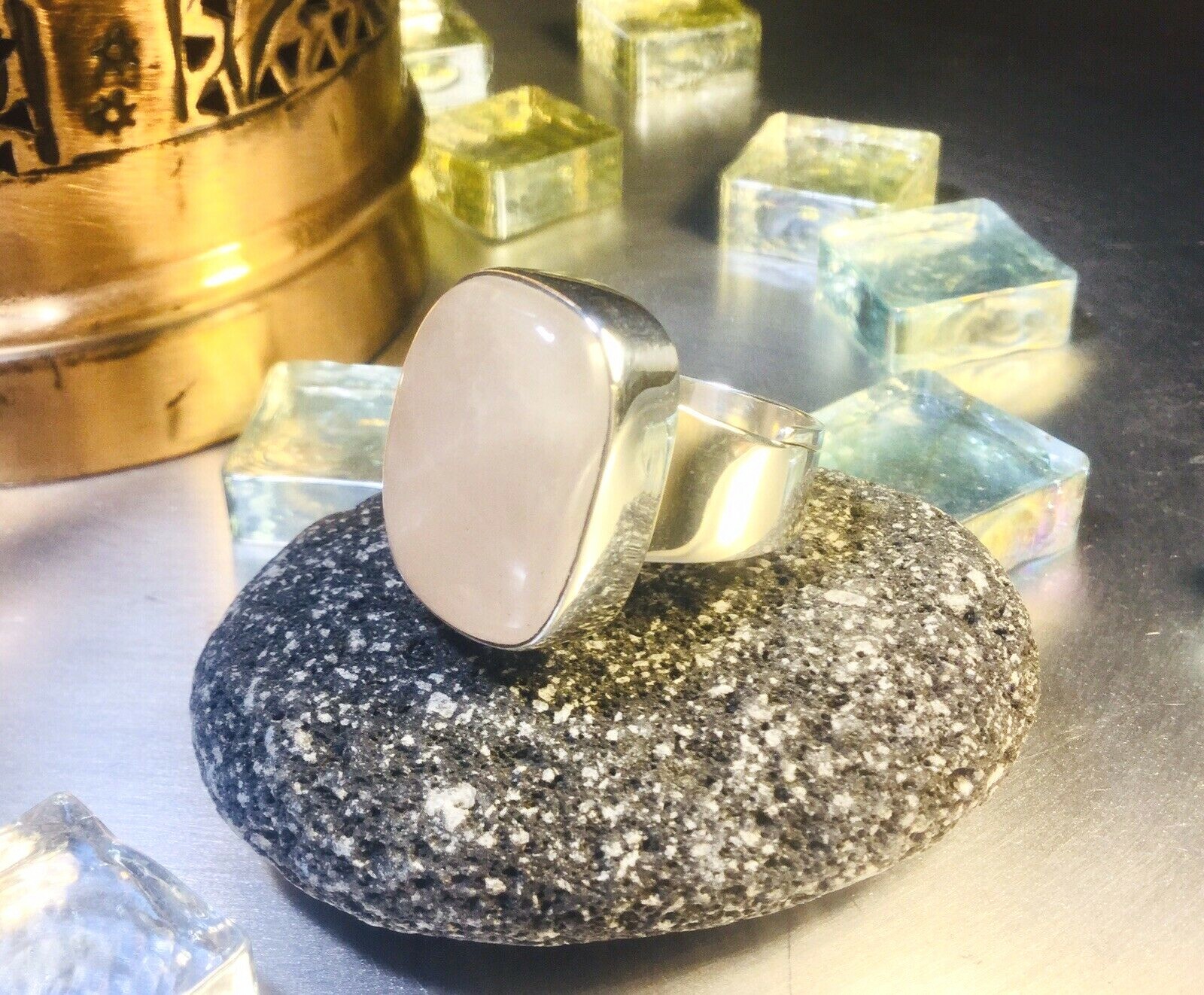 Genuine 925 Sterling Silver Large Natural Rose Quartz Adjustable Ring Size 8.5