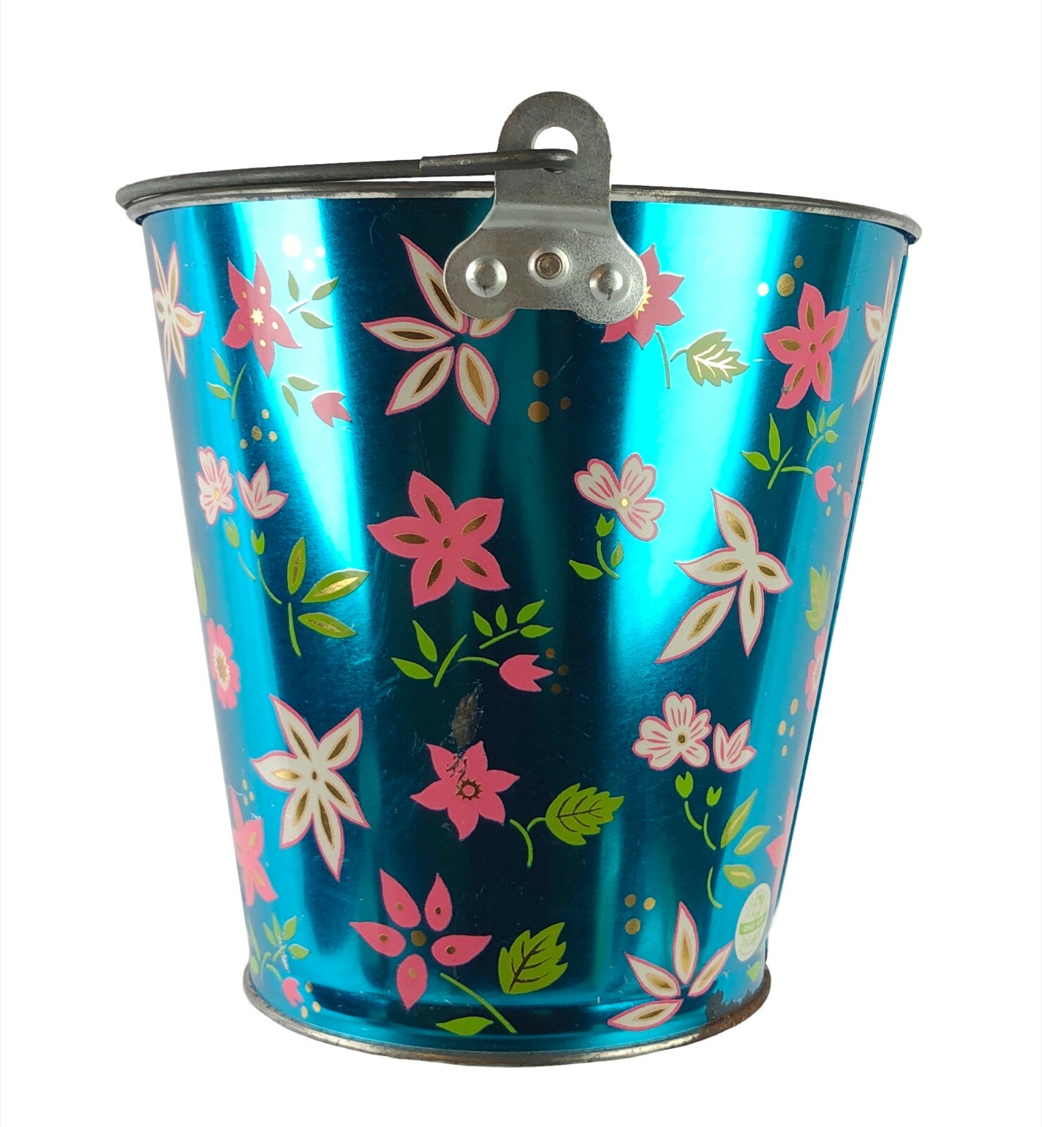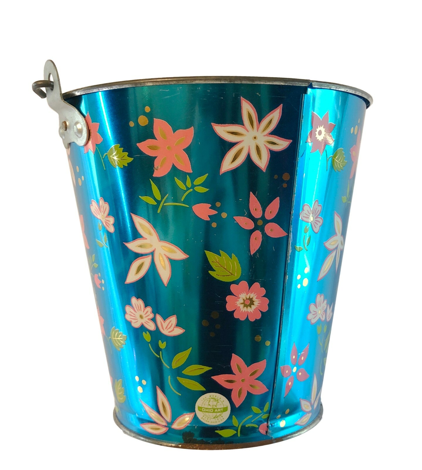 как выглядит Vintage 1960s Ohio Art Colorful Tin Litho Toy Bucket Blue Pink Yellow Flowers 6" фото