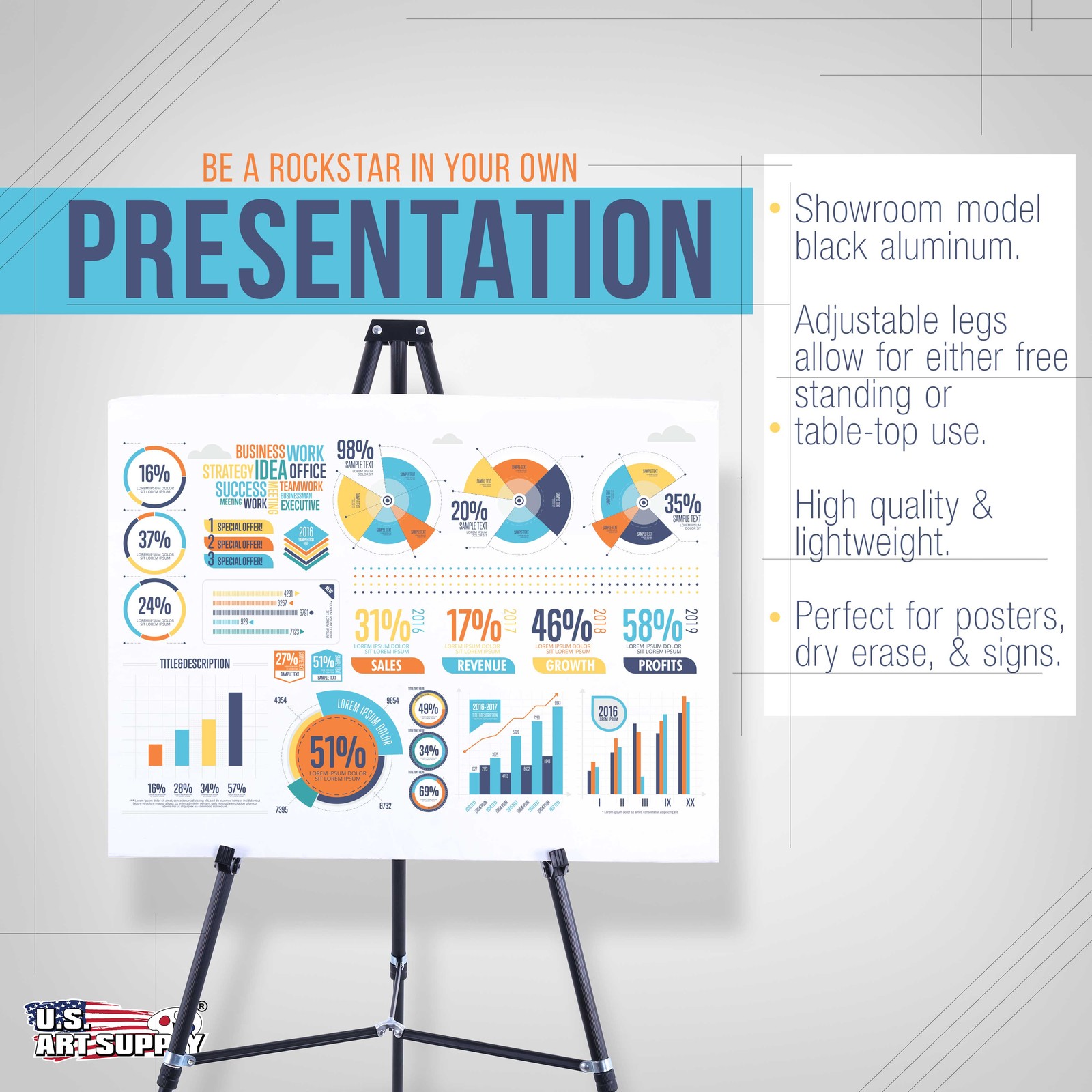 66 Black Aluminum Display Easel and Presentation Stand, Floor and Tabletop Use