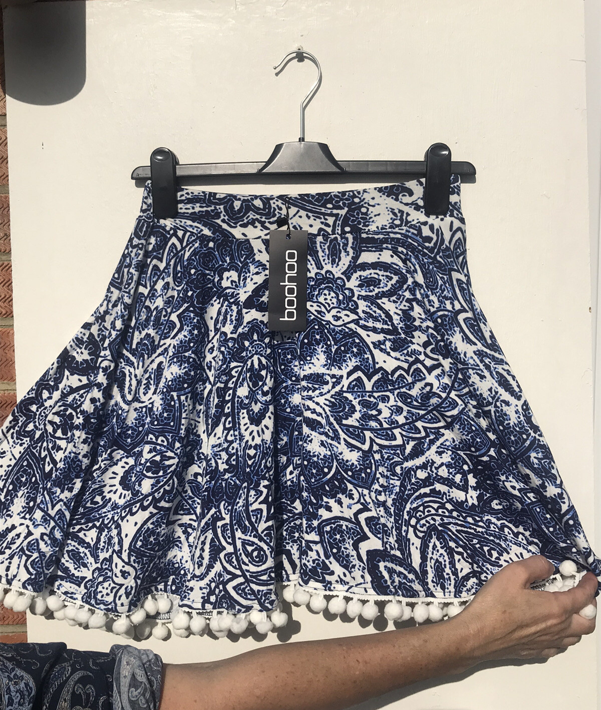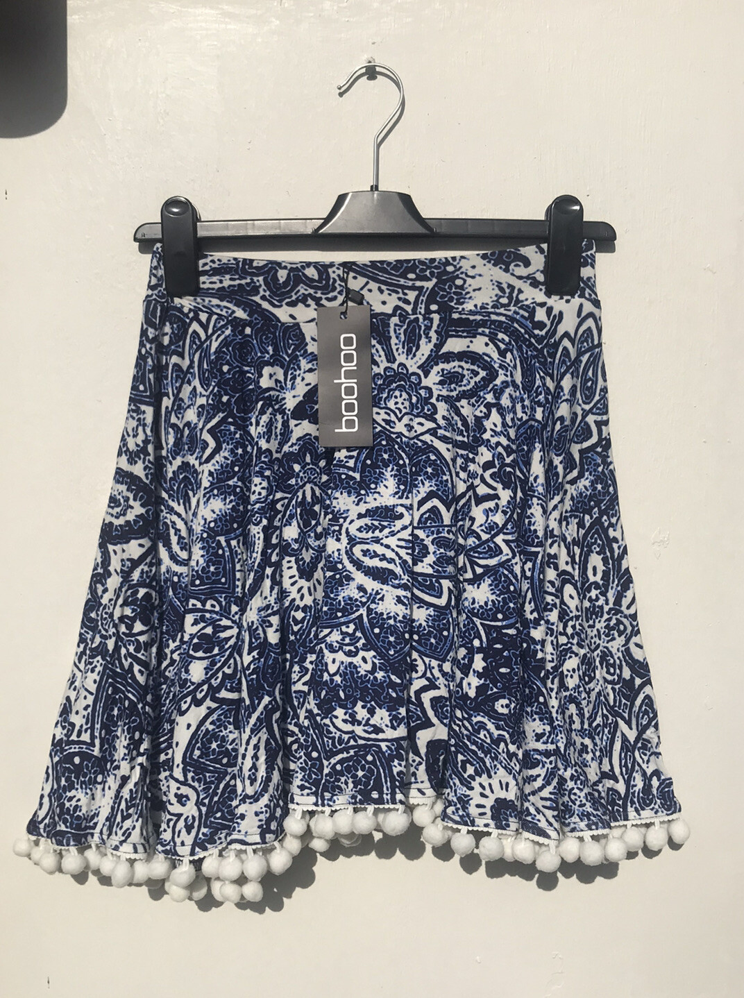 как выглядит Boohoo Size 8 Blue White Pom Pom Skater Skirt Bnwt фото